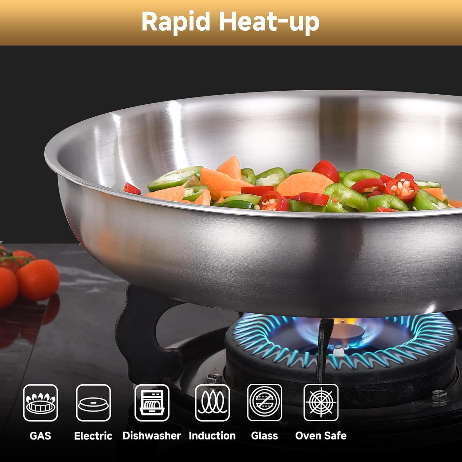 - Universal Stovetop Compatibility: This versatile stainless steel pan works seamlessly on gas, electric, induction, and halogen stovetops. Its flat, warp-resistant base ensures optimal contact for efficient heat transfer, whether you’re stir-frying or slow-cooking