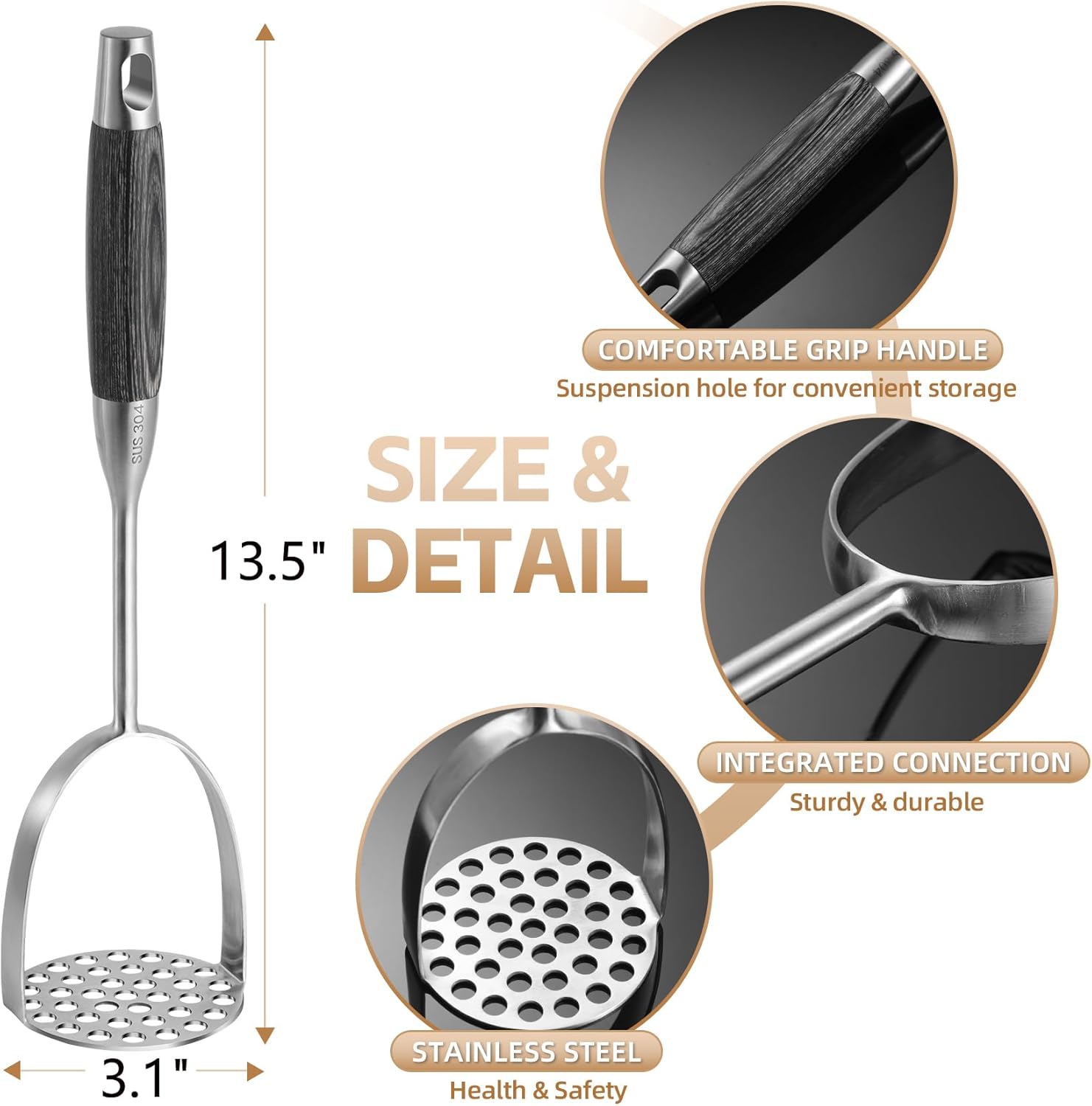 - HEAVY DUTY STAINLESS STEEL;This potato masher is made of stainless steel, which is not prone to shaking, ensuring faster and more uniform mashing of foods.