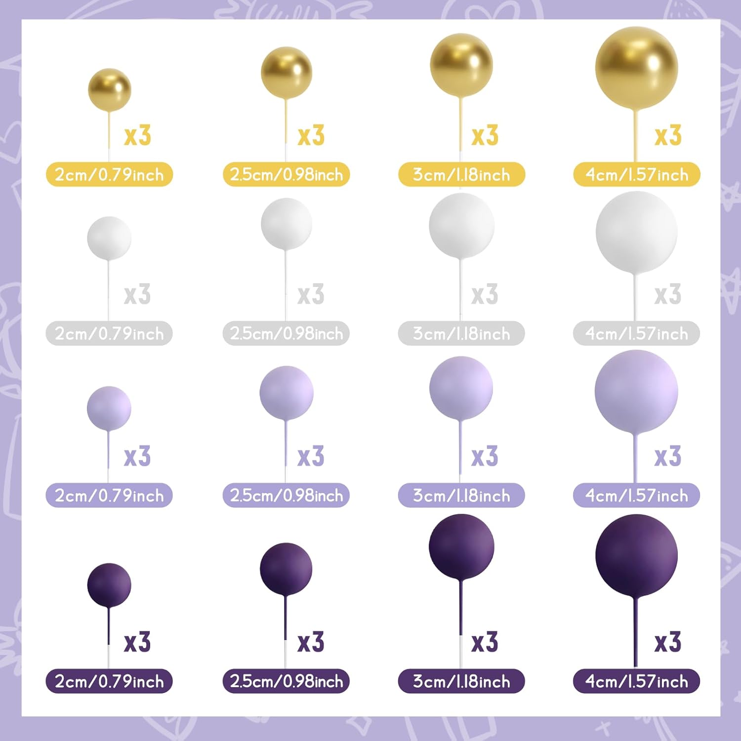 48 Pcs Balls Cake Topper Decorations Balloon Cupcake Toppers Foam Cake Topper Balls Cake Balls Decorations for Birthday Party Wedding Cake Decorating (Purple, Light Purple, White, Gold)
