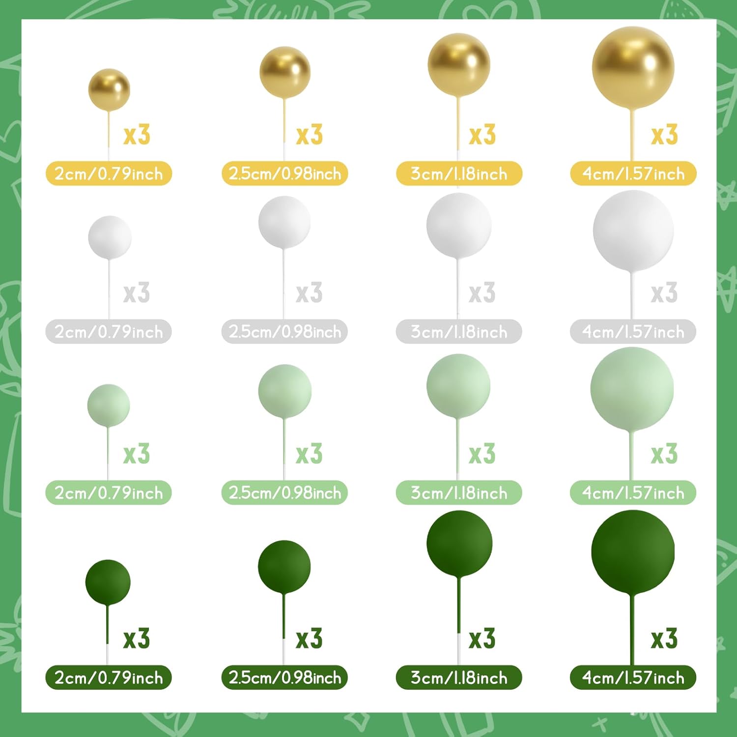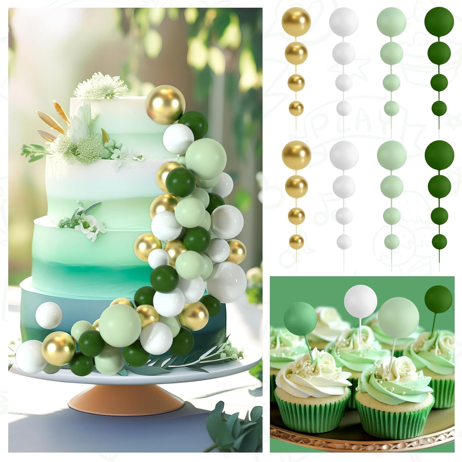 - Package Includes: You will get 48 pcs cake balls decorations in 4 colors and 10 butterflies cake decoration, including green, light green, white and gold. 12 pieces of each color. The quantity of each sizes and colors included in each set are as shown in the picture
