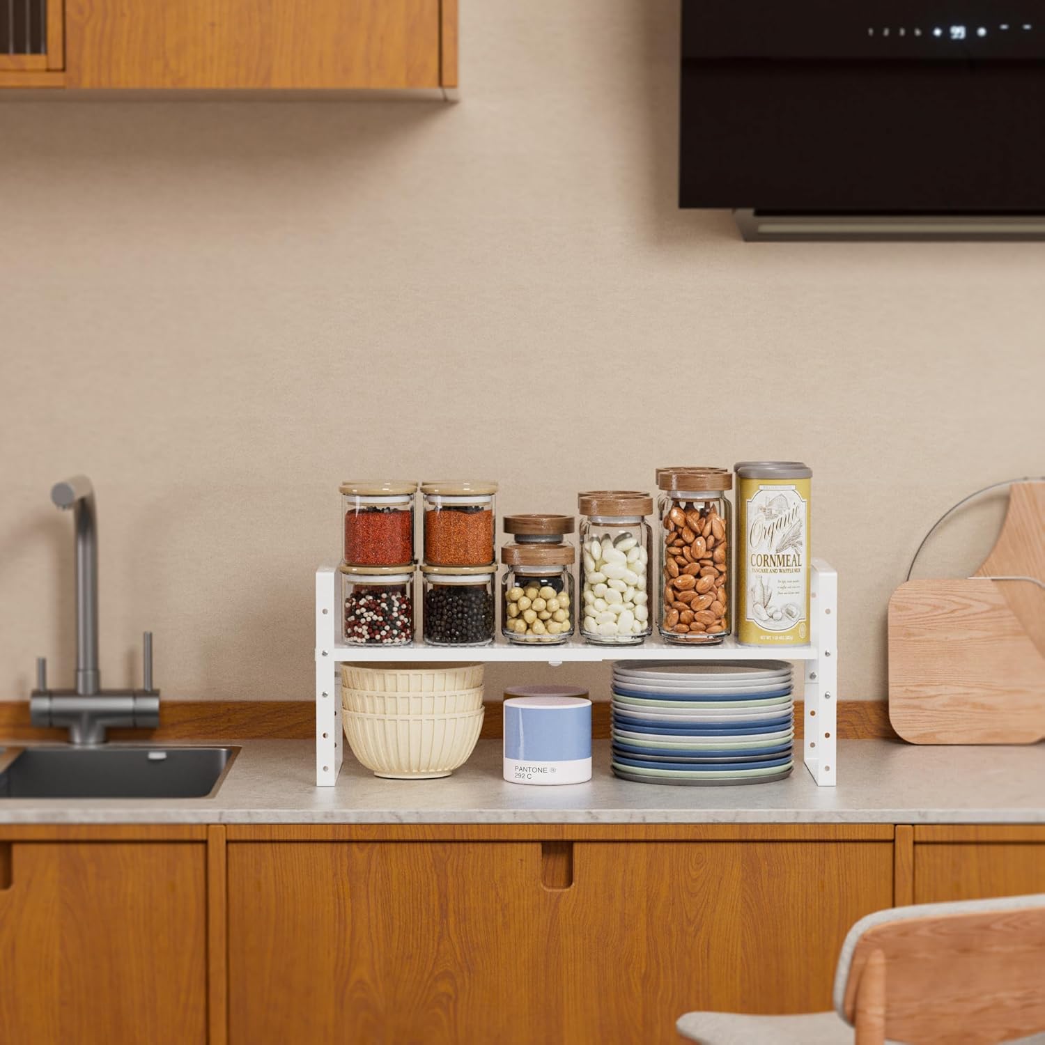 - ⭐【Versatile Spice Shelf for Cabinet】This adjustable kitchen counter stand shelf instantly create additional storage space.It is very helpful to organize the Bottles, Cans, Bowls, Plates, Pans, Soup pots in kitchen,Pantry and cupboard.Also a great space-saving option for the bedroom, study, sitting room, bathroom, and more.In particular, our larger sizes can be used as shoe racks alone.