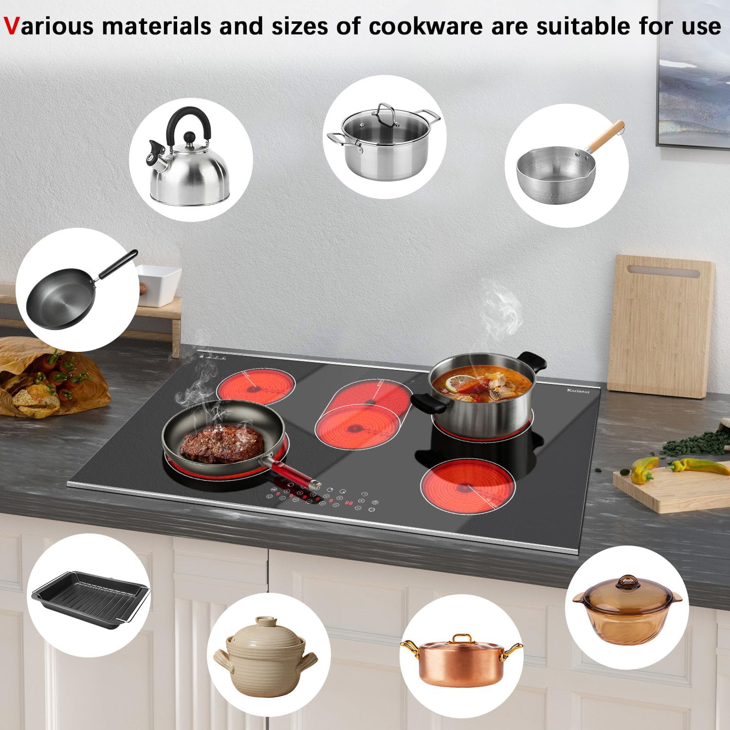 Karinear Electric Cooktop 36 Inch, 5 Burners Electric Stove Top, Built-in Glass Radiant Electric Ceramic Cooktop, Expandable Zones, Lock, Timer, Pause, Metal Edged Protection, 8400W 220~240v Hardwired