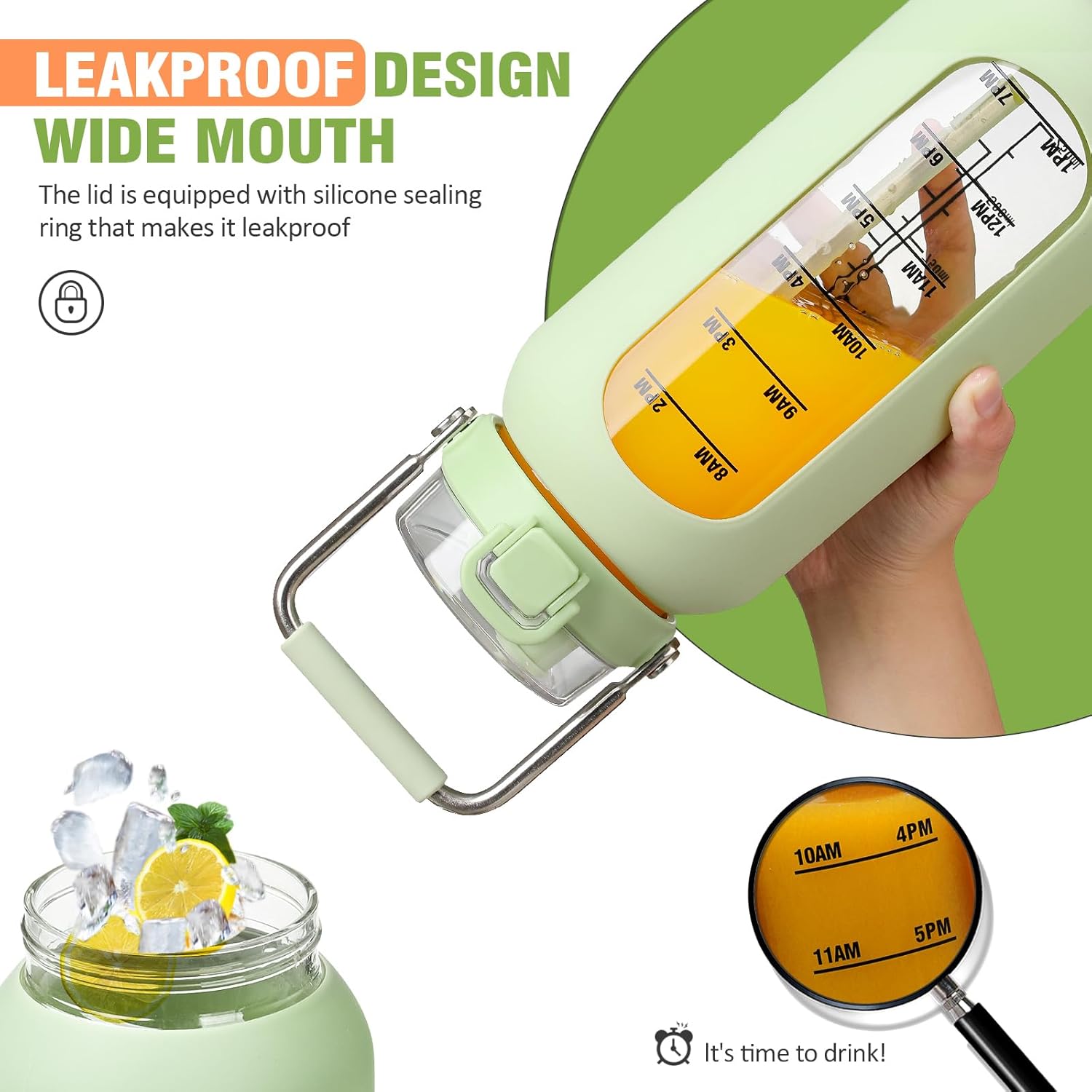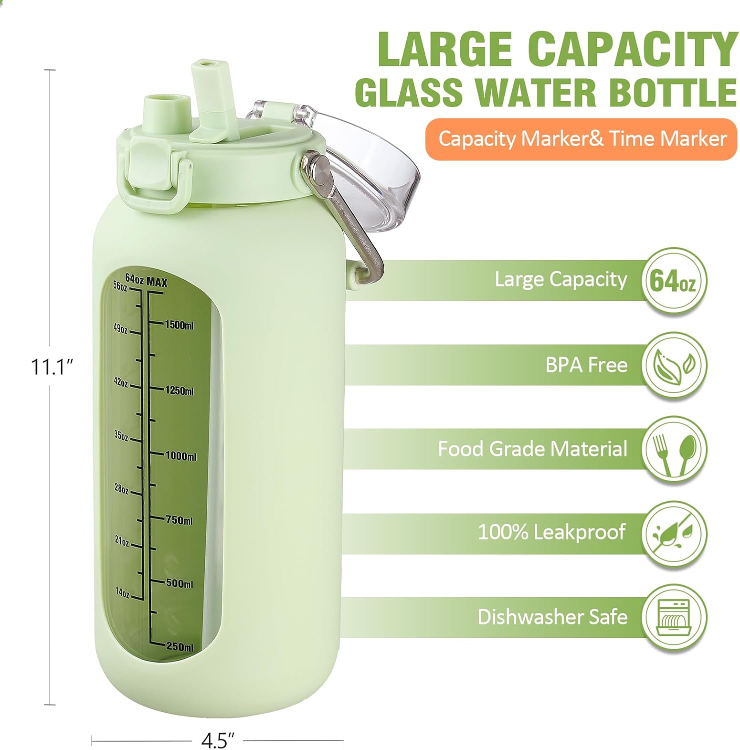 kytffu 64 oz Glass Water Bottle with Straw and Stainless Steel Handle, Half Gallon Water Bottle with Silicone Sleeve and Time Marker, 2L Large Glass Bottle for Gym, School, Travel, Leak-proof (Green)