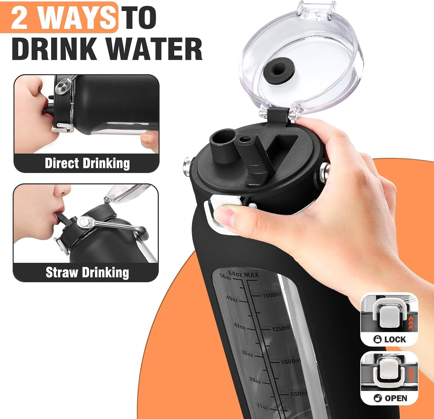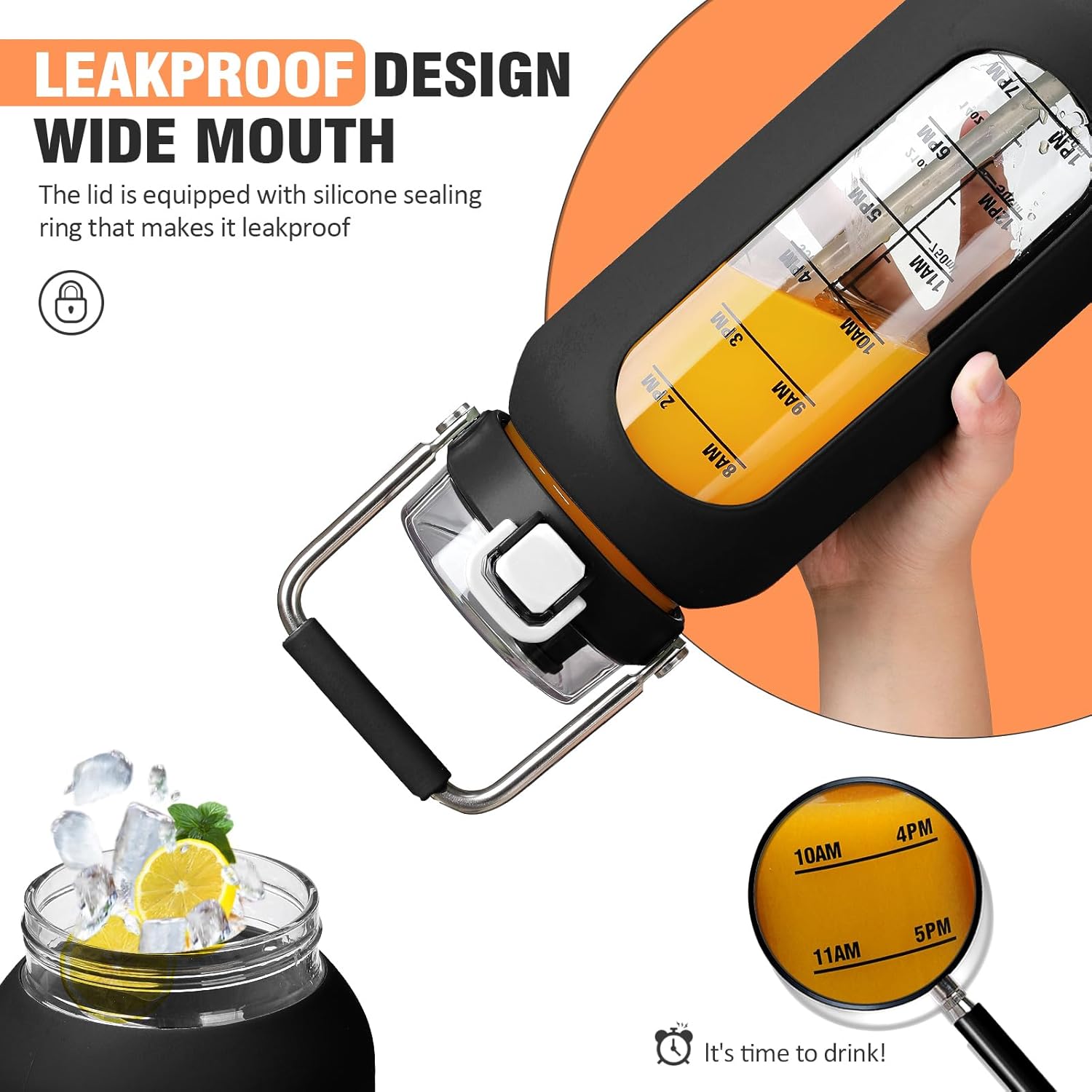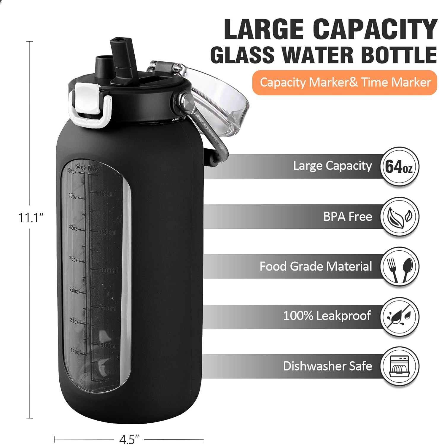 kytffu 64 oz Glass Water Bottle with Straw and Stainless Steel Handle, Half Gallon Water Bottle with Silicone Sleeve and Time Marker, 2L Large Glass Bottle for Gym, School, Travel, Leak-proof (Black)