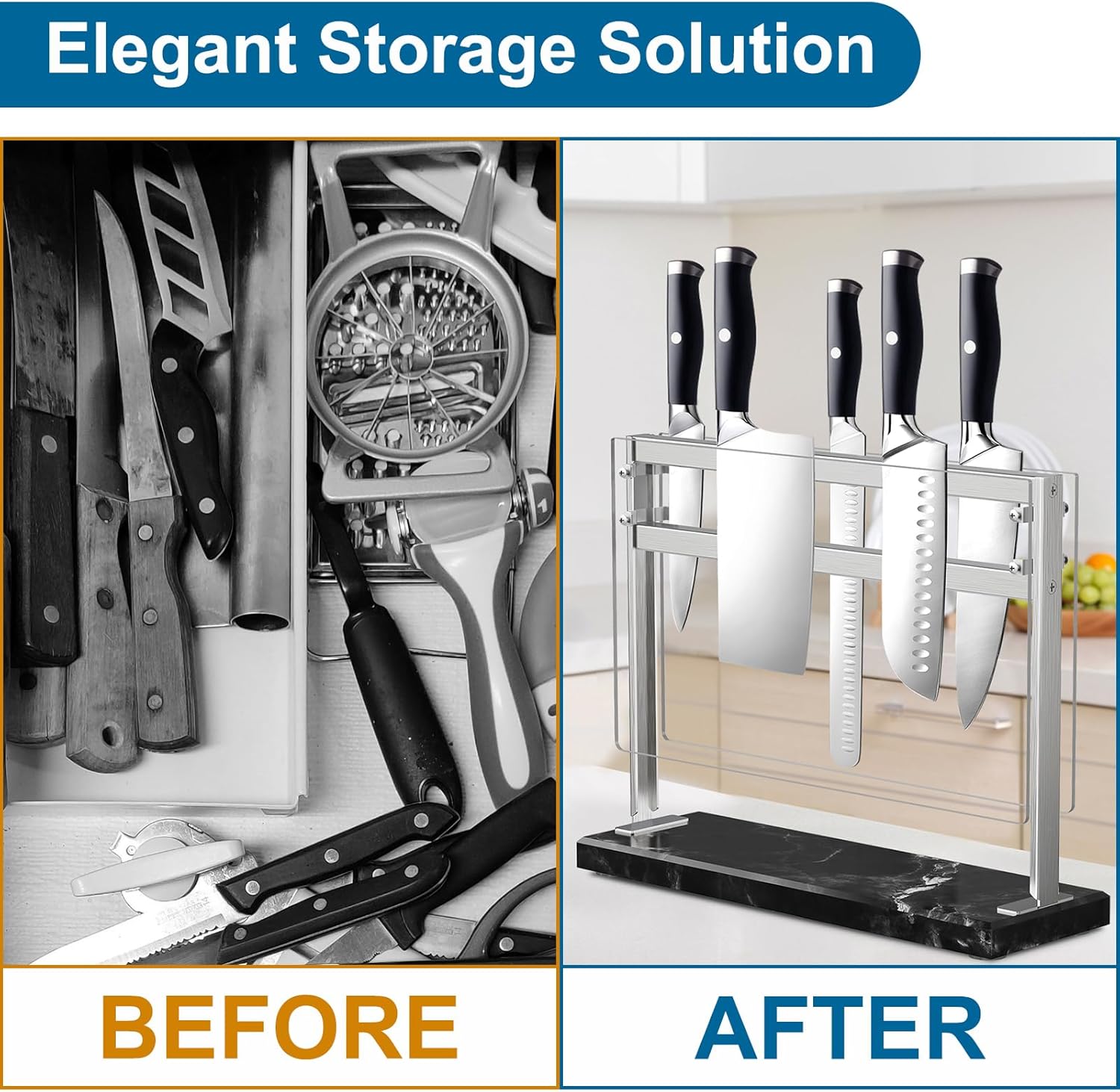 - 【Innovative Patented Design】Showcasing a fusion of high-grade 304 stainless steel, excellent marble,and premium acrylic shield. this knife holder is not only aesthetically modern and elegant but also features a unique patented design. It brings a contemporary and stylish vibe to your kitchen, setting it apart from ordinary kitchen accessories.