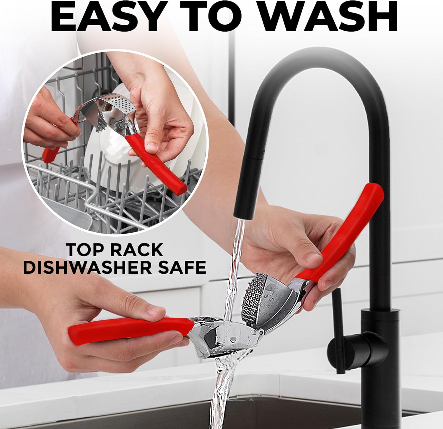 - EASY TO CLEAN: Simply rinse your garlic and ginger press tool under running water and use the included cleaning brush to get rid of any garlic bits or place it in the dishwasher for a quick clean up. Can be washed on the top rack dishwasher but hand wash is suggested. We recommend rinsing the garlic crusher right after use to avoid residual pulp and fibers hardening up.