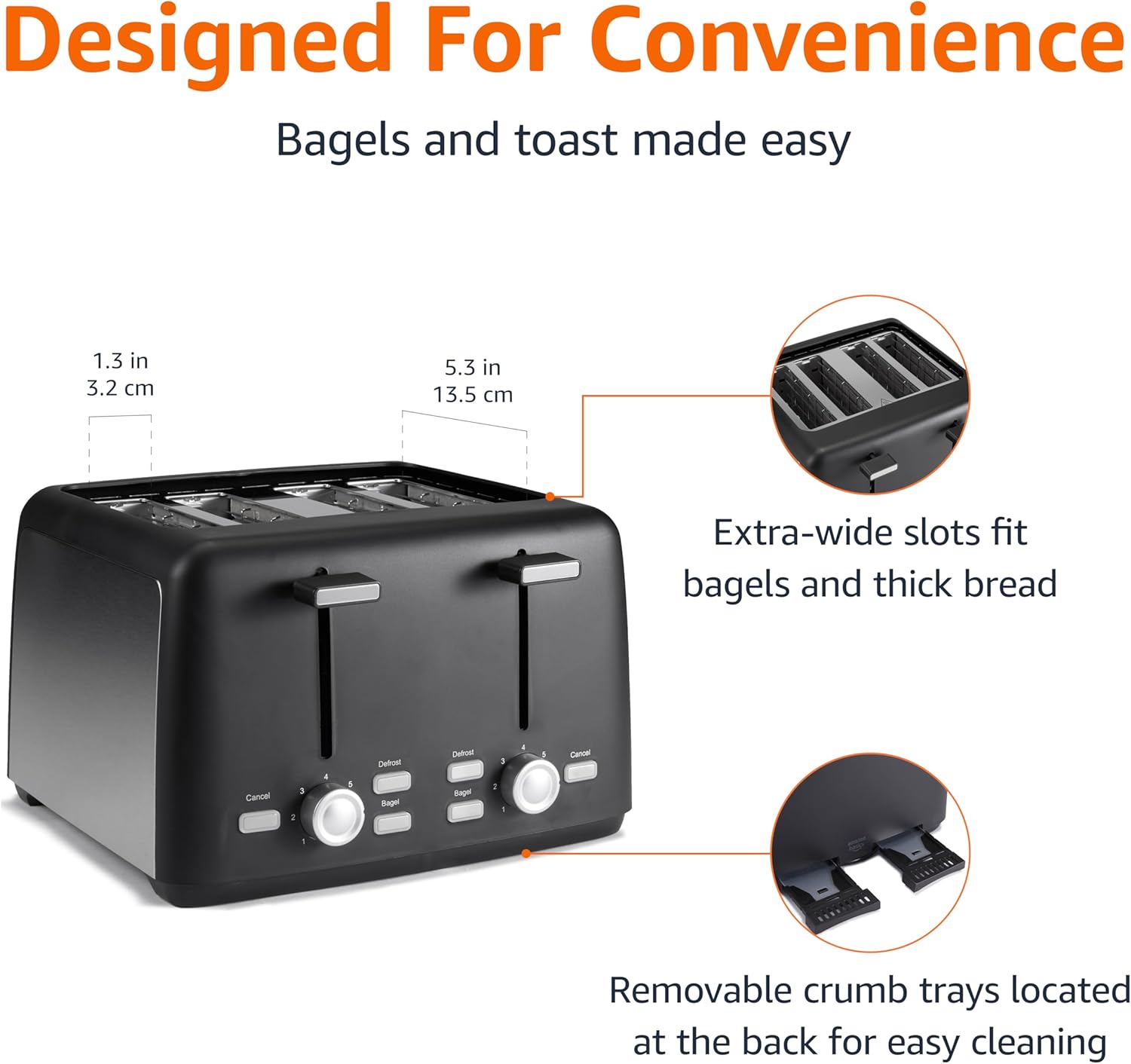 - Extra-Wide: 5.25" x 1.25" slots fit thick bagels and artisan breads with ease