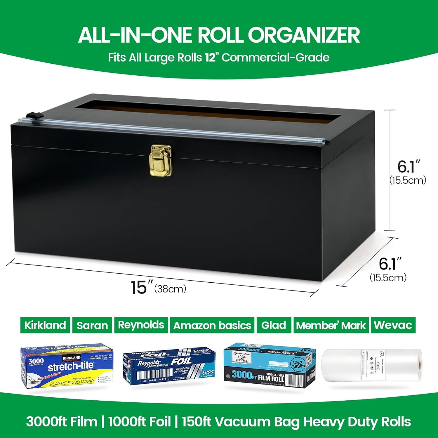 12" Black Commercial Foil & Plastic Wrap Dispenser Organizer w/Slider Cutter & Roller - Heavy Duty XL Holder for 3000ft Film, 1000ft Foil Rolls - Kitchen, Restaurant, Foodservice Storage