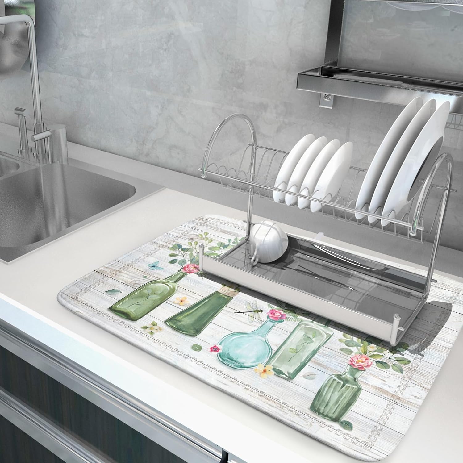 Fern Leaf Vase Dish Drying Mat 18x24 Inch Eucalyptus Leaves Microfiber Absorbent Dish Drainer Mat Reversible Drying Pad for Kitchen Counter Sink