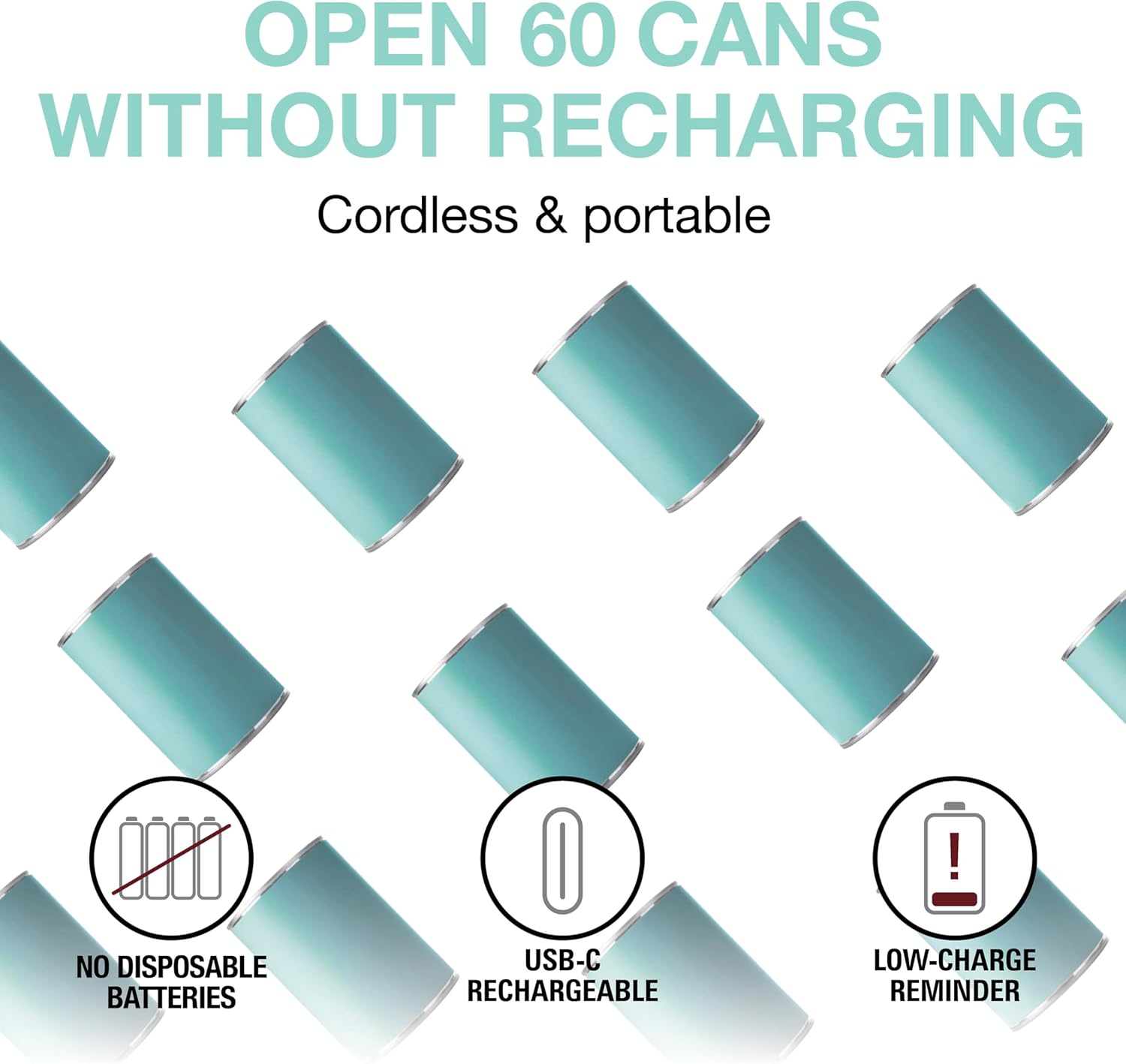 - OPENS 60 CANS ON A SINGLE CHARGE: This portable, rechargeable can opener is great for cookouts, picnics, camping and more. It has a battery indicator light that shows when it needs to be charged, and it fully charges in just 2 hours.