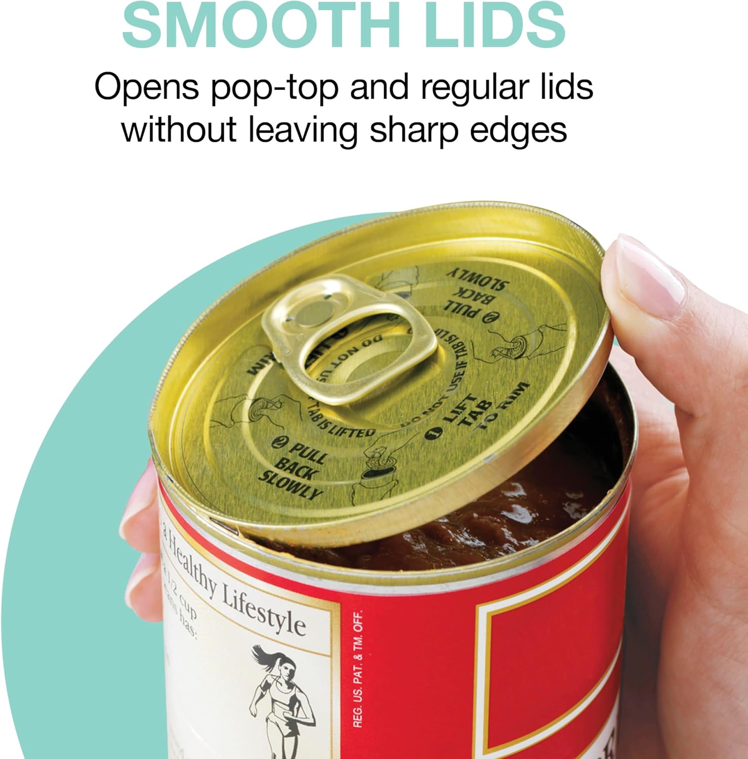 - SMOOTH, TOUCHABLE LID EDGES — This automatic can opener cuts cans along the side, eliminating sharp edges on both pop-top or regular cans. The blade stays clean because it doesn't touch food, and the lid can be reused to store leftover canned food in the fridge.