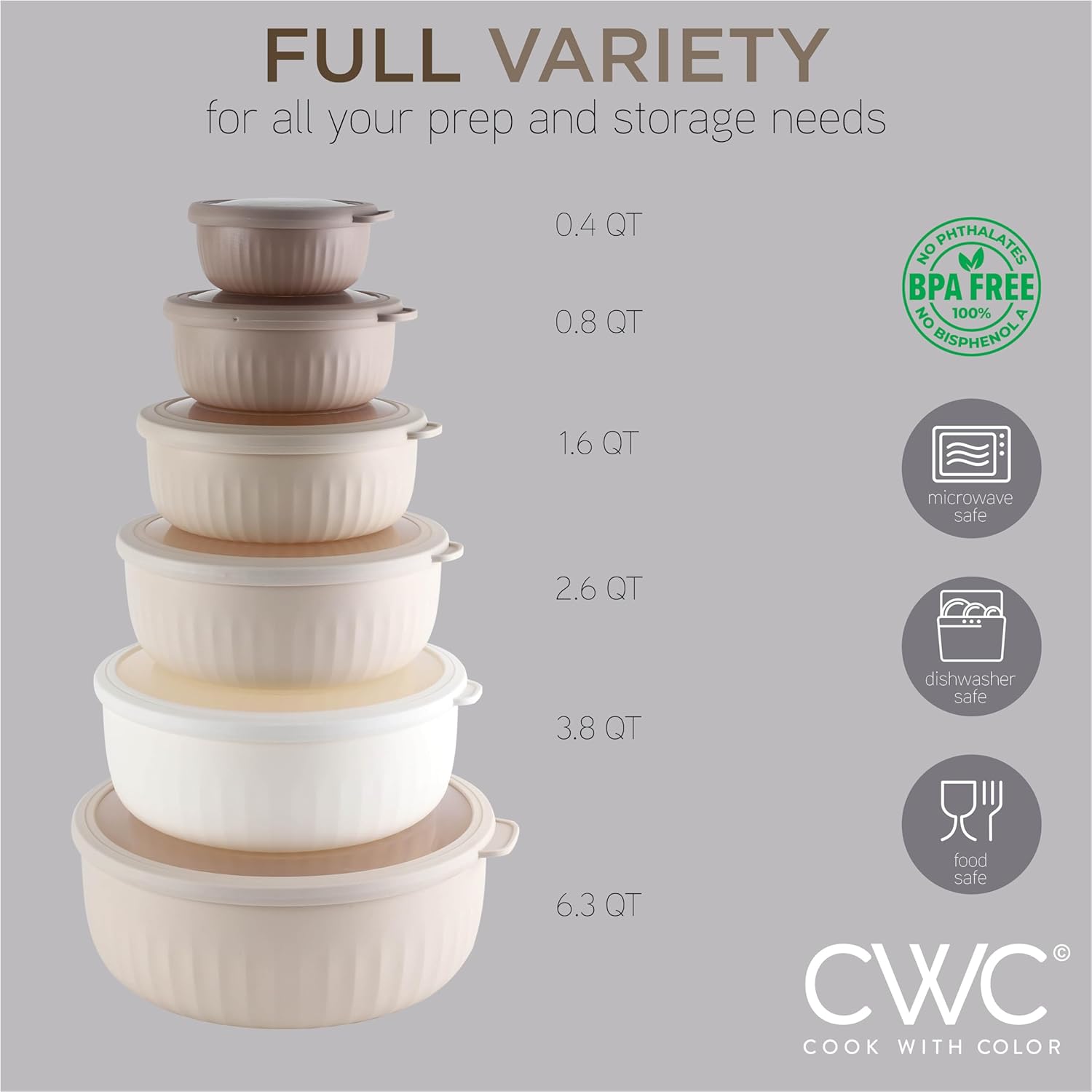 - Cook with Color 12 piece plastic mixing bowl set - non slip bowls with lids; easy to clean, sturdy mixing bowls.