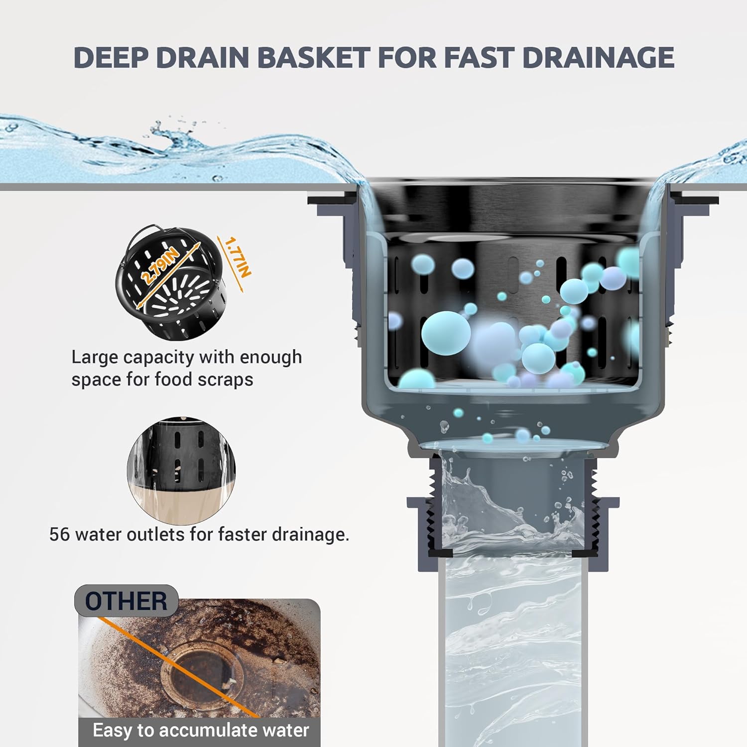 - DURABLE STAINLESS STEEL: The black kitchen sink drain is made of premium 304 stainless steel for durability and resistant to rust and corrosion to provide reliable filtration for years to come (NOTE: It can not be connected to the garbage disposal.)
