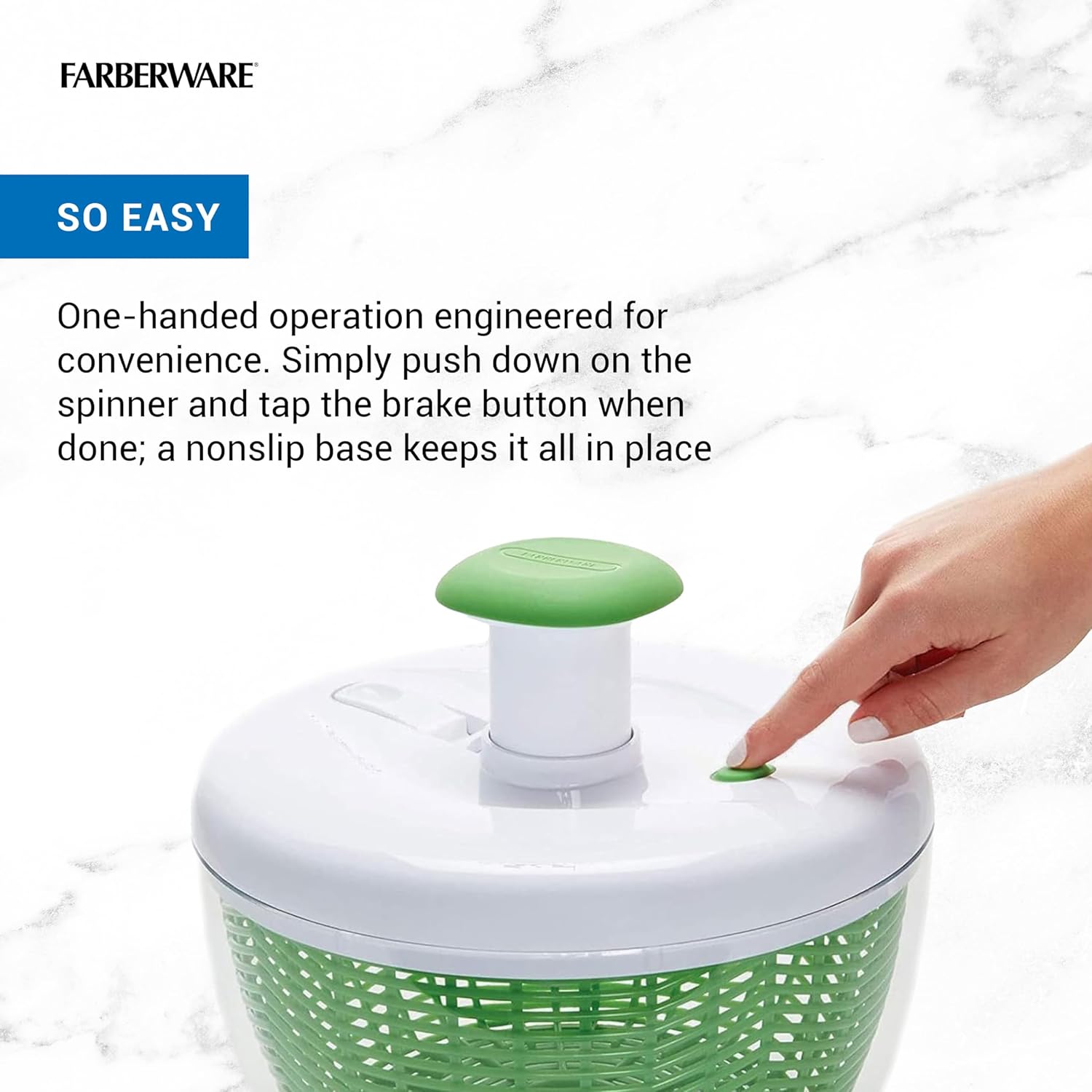 - SO EASY: We know you're busy when it comes to making meals, so we've engineered our small salad spinner for convenient one-handed operation; simply push down on the spinner mechanism to begin; then tap the brake button when done