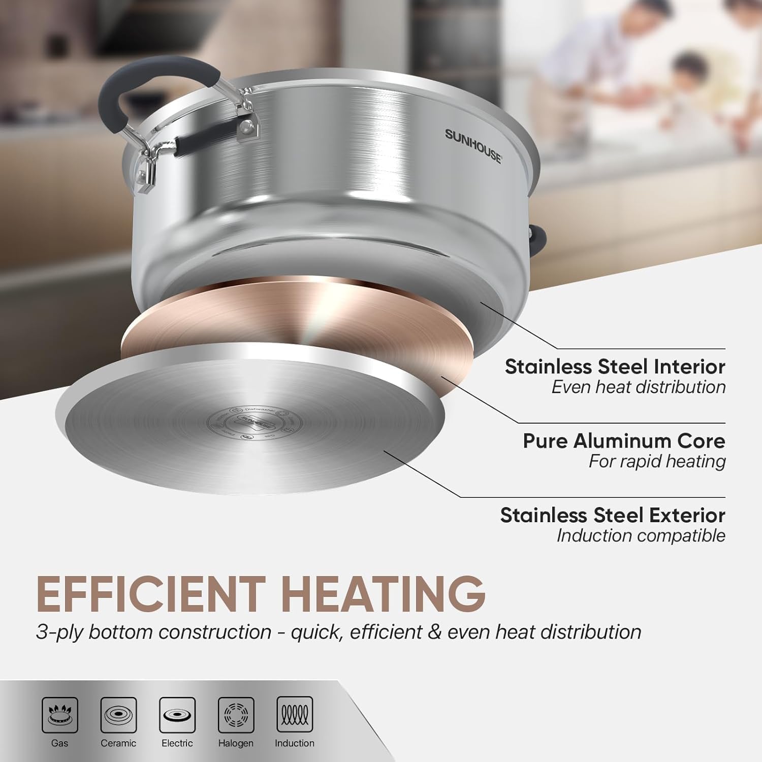 Sunhouse - 4.6 Quarts Steamer Pots With Lid 2-Tier Multipurpose Stainless Steel Steaming Pot Cookware For Vegetable, Dumpling, Sauce, Food - Triple Bottom, Measurement Line