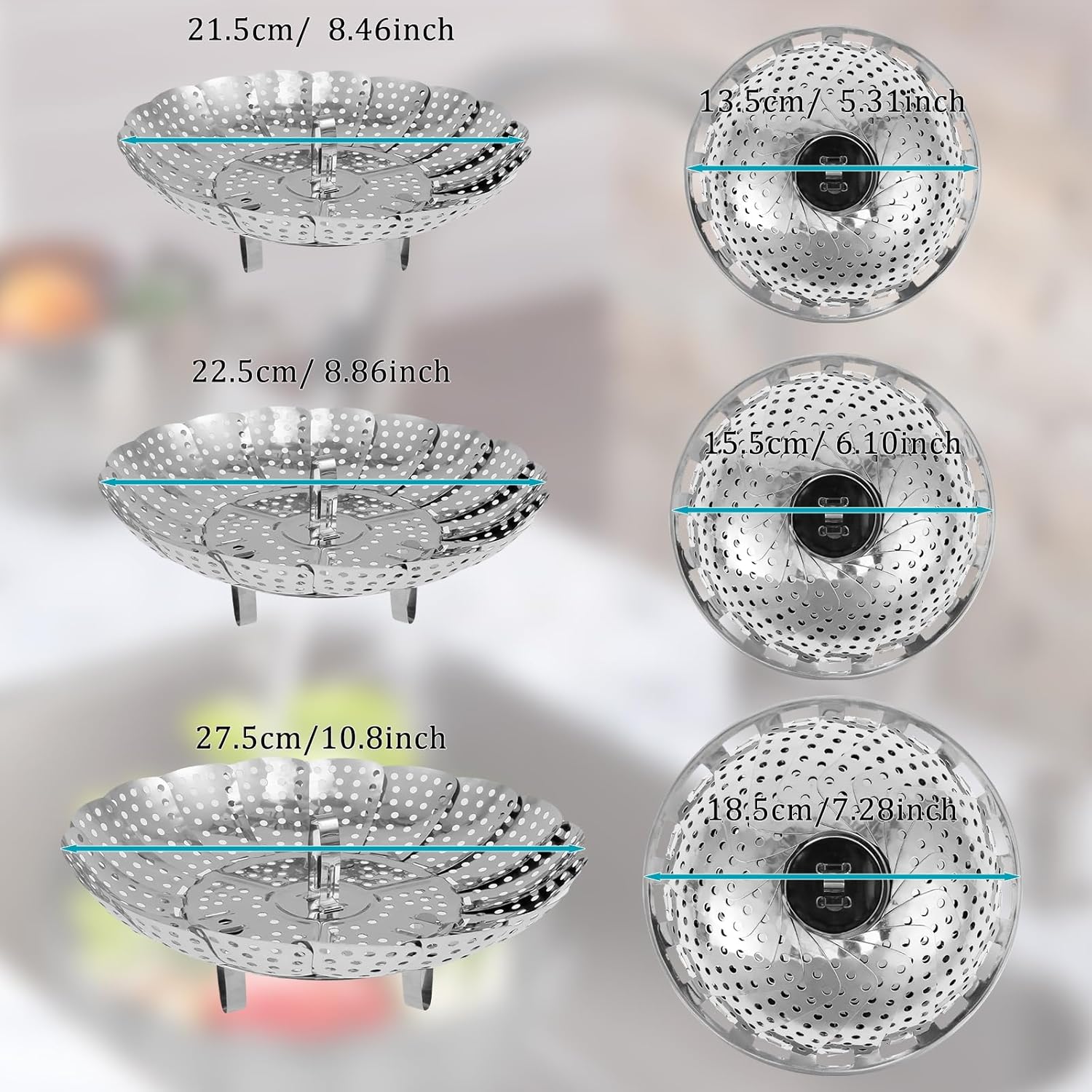 - 【Expandable & Collapsible】Engineered with sturdy collapsible pedals, our vegetable steamer for cooking smoothly expands from 5.3/ 6.1/ 7.2" to 8.4/ 8.8/ 10.8". The "wings" that fold in and out allow the steamer fit a variety of cooking containers including pans, saucepans and frying pans, and can also be used as steamer inserts for Instant Pot and pressure cookers. Unlike bulky bamboo steamers, it collapses compactly for easy storage to save storage space unlike bulky bamboo steamers.