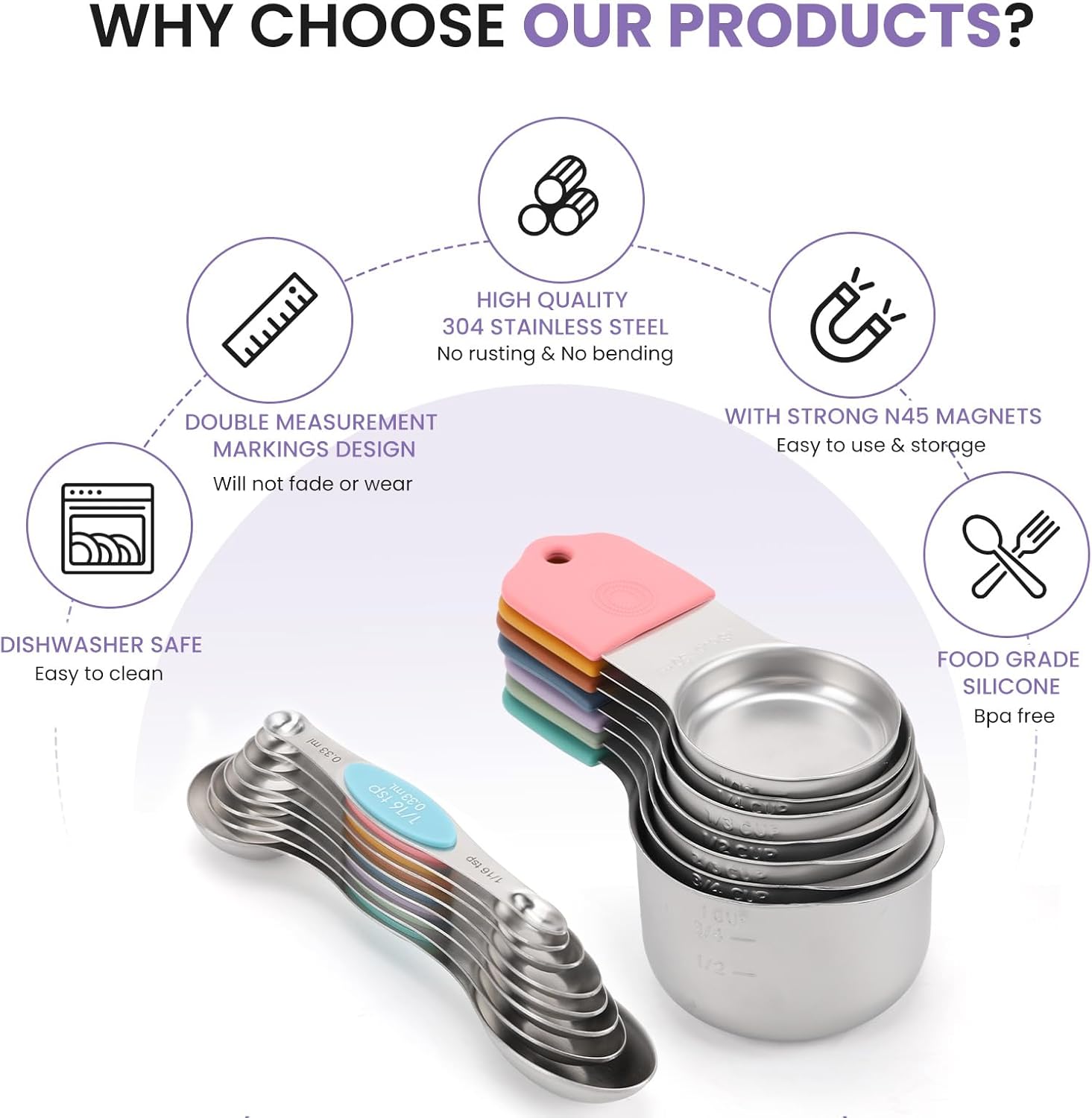 - Measuring cups and spoons set:16 pieces of high-quality magnetic stainless steel measuring cups and spoons set, including 7 measuring cups, 8 measuring spoons and 1 plus leveler. This set of magnetic measuring cups and spoons is made of 304 high-quality stainless steel and food grade silicone, sturdy and long-lasting, so you don't have to worry about them rusting or bending. This multi-size measuring cup and spoon set allows you to accurately measure dry ingredients and liquids when cooking or baking.