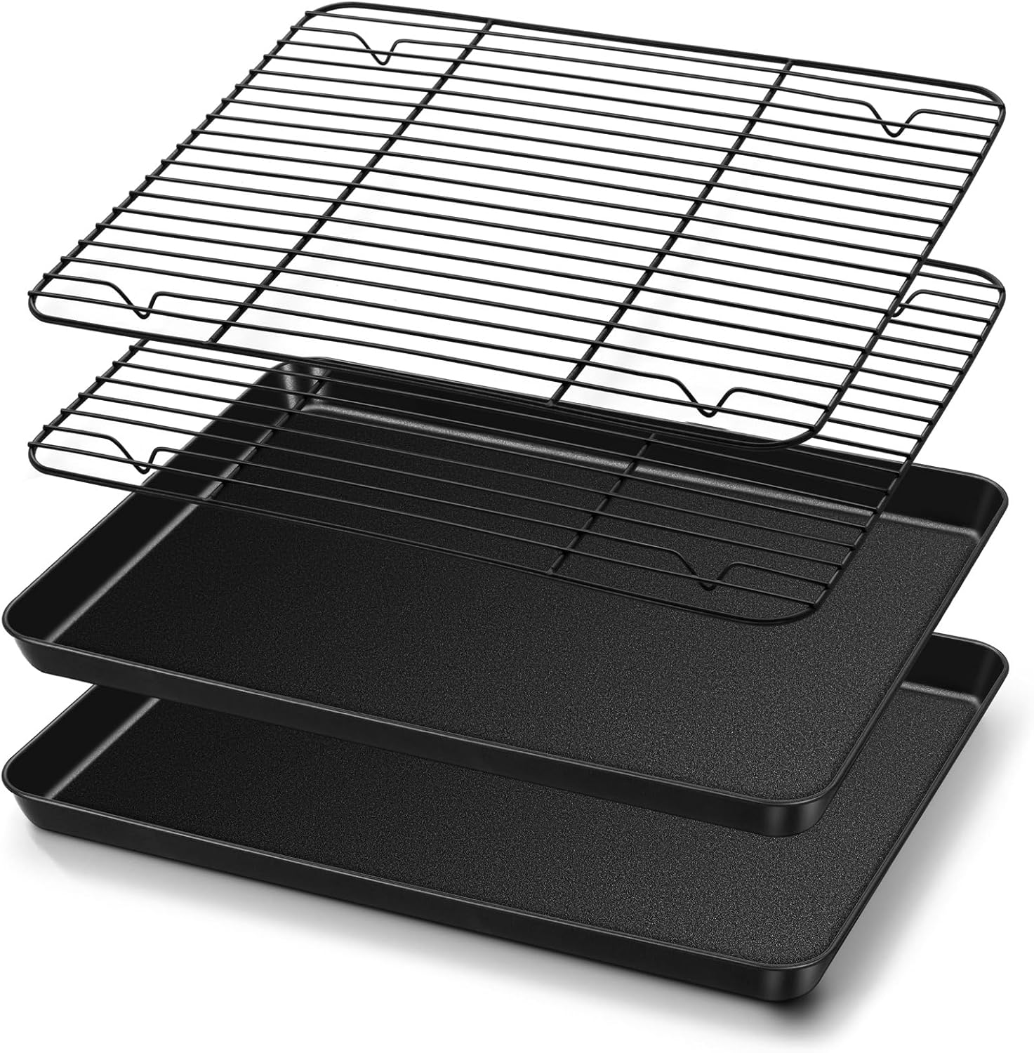 - HEALTHY & STURDY: Baking sheet is crafted from heavy-duty carbon steel, Cooling rack is made of pure stainless steel, Both pan and rack are coated with black food-grade non-stick coating, No harmful substance release into your foods, With thick gauge and sturdy construction for using longer time, A great replacement of aluminum pan and rack