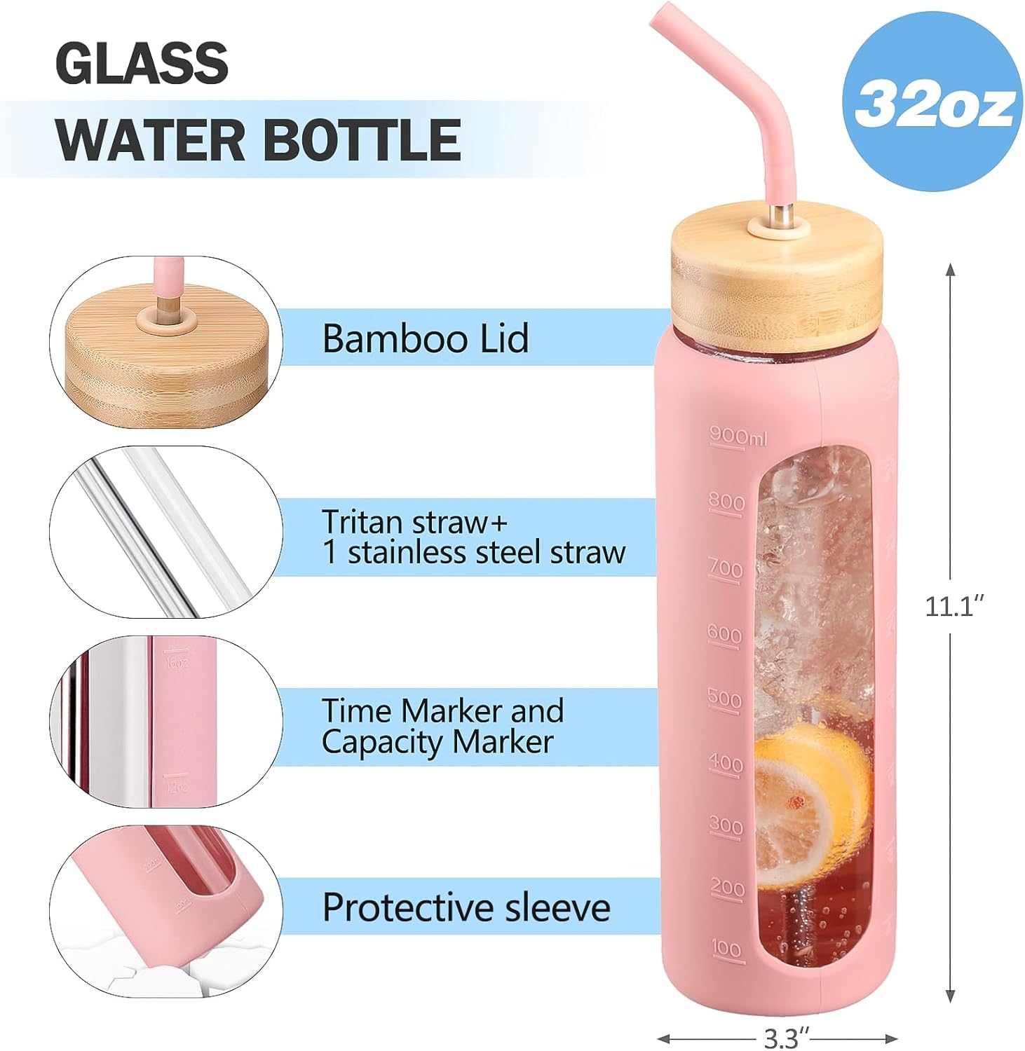 32oz Glass Water Bottle with Straw and 2 Lids- Bamboo Straw and Spout Lid with Phone Holder for Gym, Glass Drinking Bottles with Silicone Sleeve and Motivational Time Marker, Pink