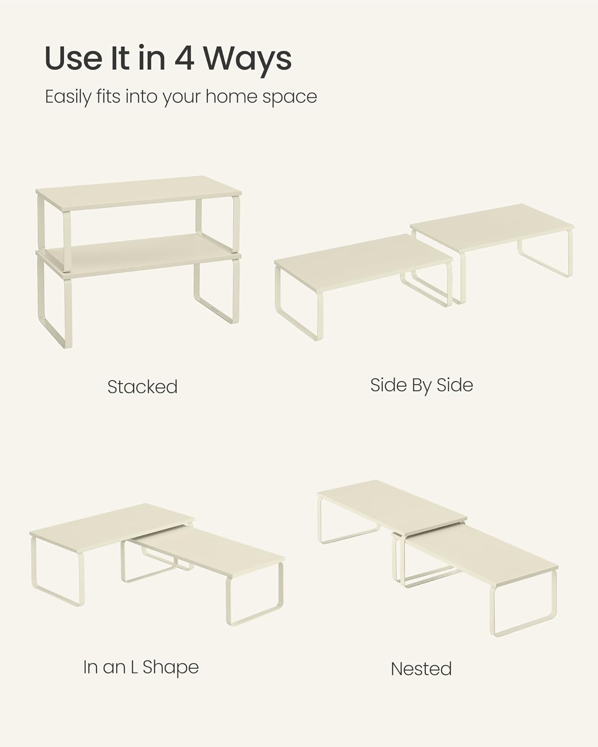 SONGMICS Cabinet Organizer Shelf, Set of 2 Kitchen Counter Shelves, Kitchen Storage, Spice Rack, Stackable, Expandable, Metal and Engineered Wood, Cream White UKCS200W02