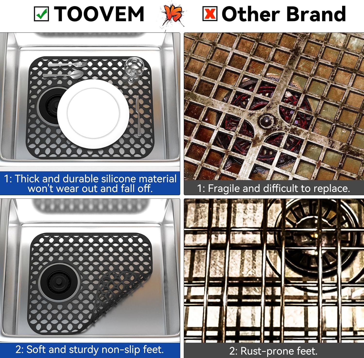 - Silicone Sink Protector Material: TOOVEM Silicone material is flexible and pliable. Silicone sink protectors for kitchen sink cushion the sudden force if dishes or bowls fall into the sink. A good sink protection for your fragile glassware and stainless steel or ceramic sink.