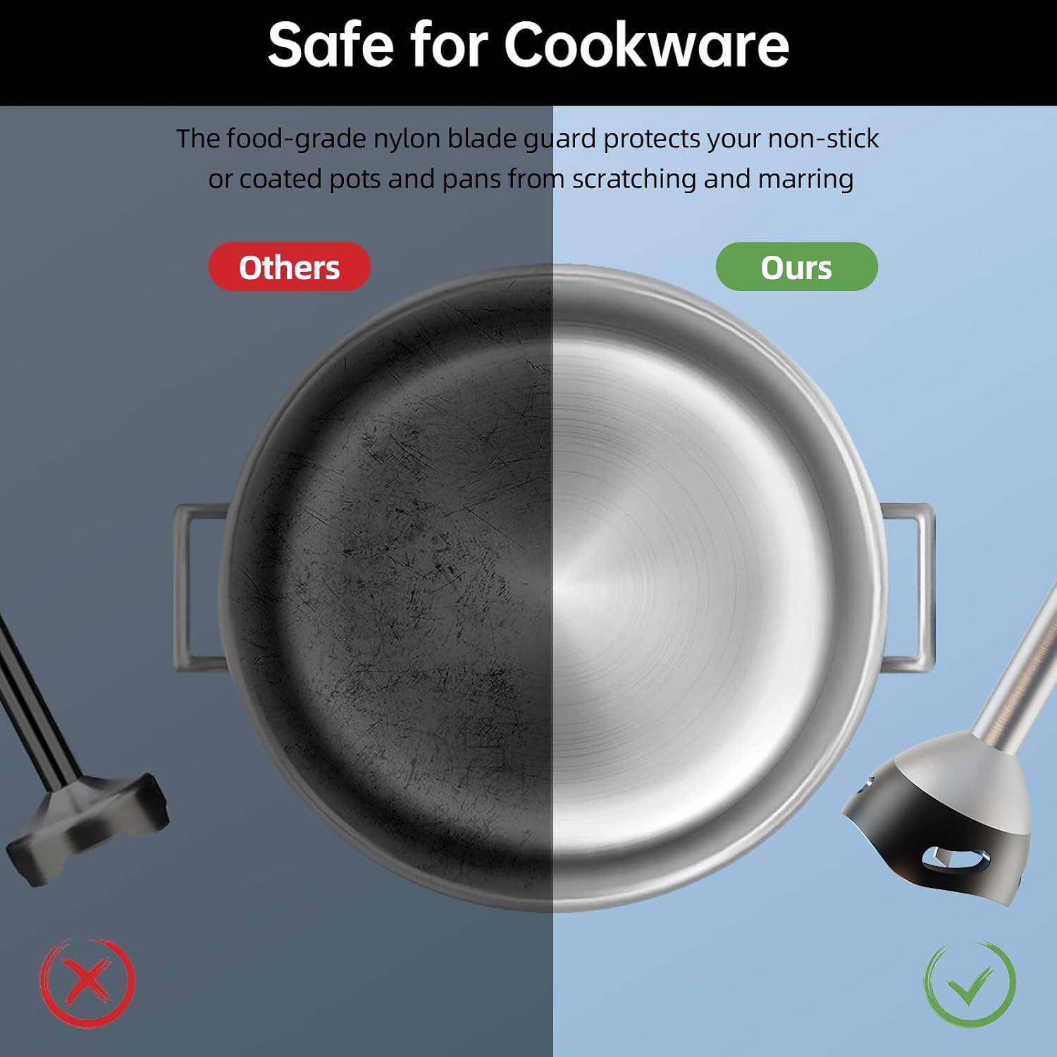 - NO MORE SCRATCHES ON YOUR CONTAINERS: Unlike other bargain brands, this hand blender has an upgraded blade guard to prevent scratches and marring on your pots, pans, and other containers. The unique bell-shaped guard also prevents splashing and ensures a spotless kitchen.