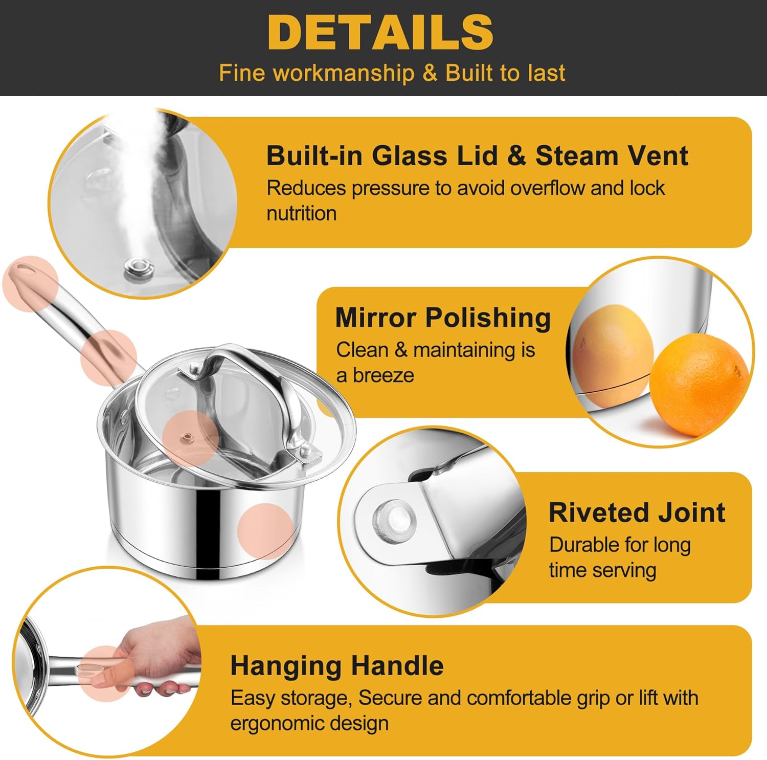 - VISIBLE GLASS LID WITH STAY COOL HANDLE - See-through tight-fitting lid allow you to effortlessly monitor the cooking process without removing, Reduces energy consumption and better locking in moisture and nutrition, With steam vent reduces pressure to avoid over boiling, Stay-cool hollow handle securely riveted with body for comfortable and secure grip, Easy storage with handing design