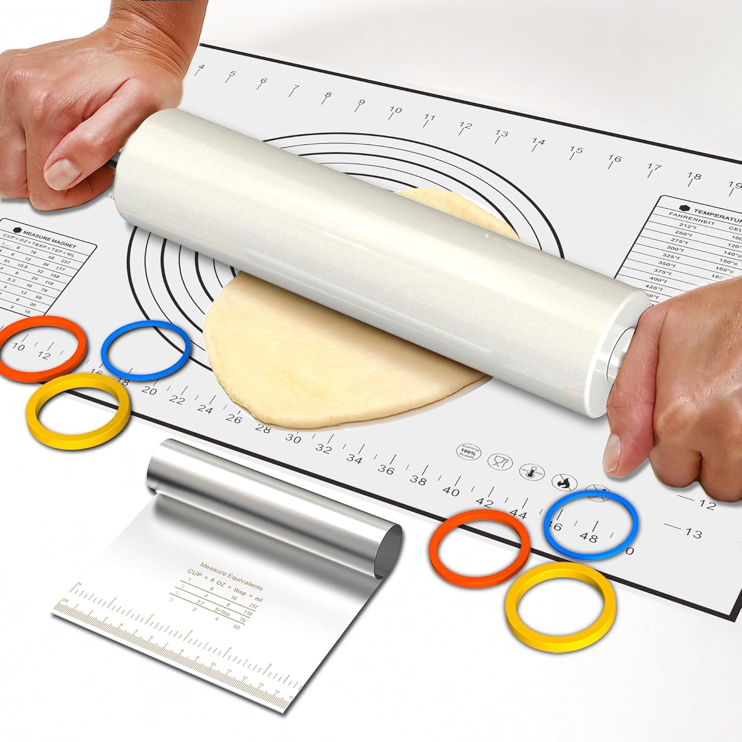 Marble Rolling Pin with Pastry Baking Mat and Stainless Steel Dough Cutter, 18.5â (Includes handle) Rolling Pin for Baking Cookie Crust Crisp Pizza with 3 Thickness Rings and Wood Stand
