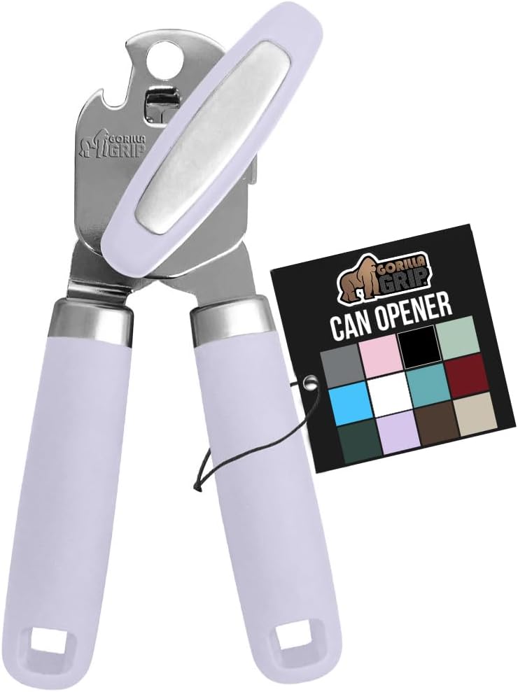 GORILLA GRIP Heavy Duty Stainless Steel Smooth Edge Manual Can Opener and Bottle Openers, Soft Comfortable Handle, Oversized Handheld Turn Knob, US Designed Multifunctional Kitchen Tool, Lavender