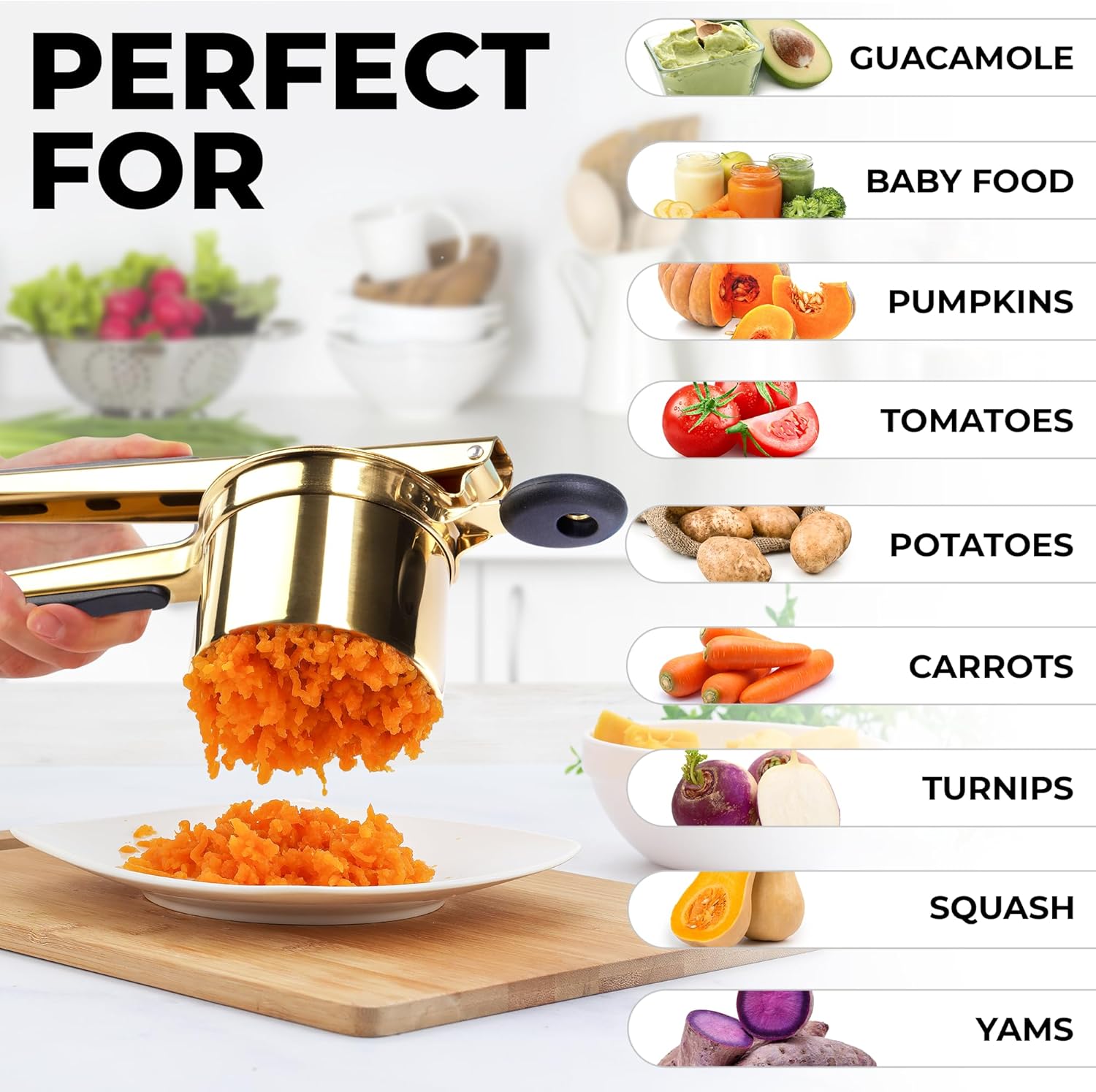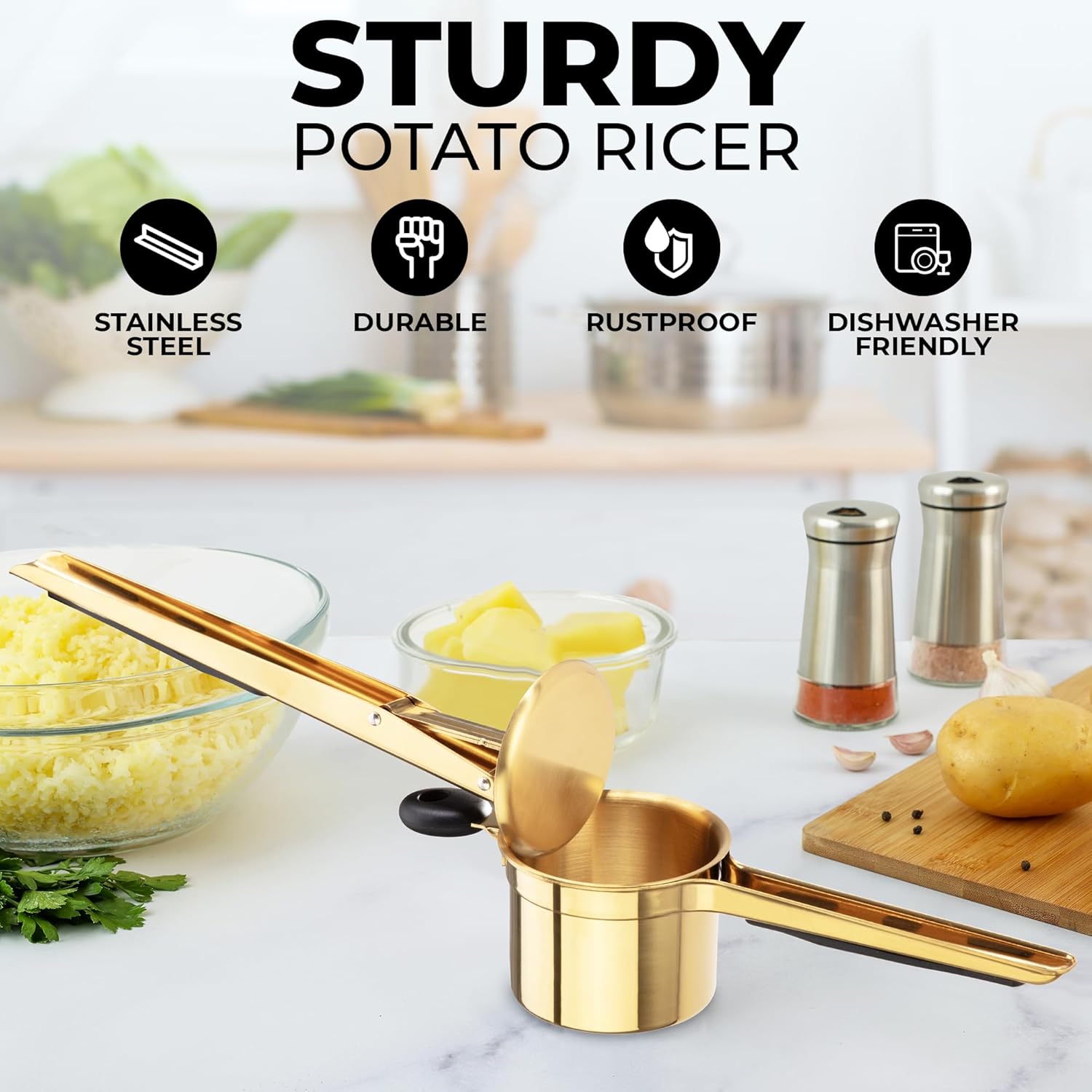 Zulay Kitchen Large 15oz Potato Ricer, Heavy Duty Stainless Steel Potato Masher and Ricer for Mashed Potatoes, Mashed Potato Masher & Potato Press Gadget for Perfect Mashed Potatoes - Gold/Black