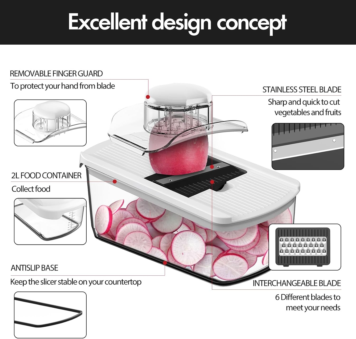 Cambom Mandoline Slicer Vegetable Slicer Spiralizer With 2 L Container for Potatoes, Tomatoes, Cucumbers, Carrots With 6 Blades White