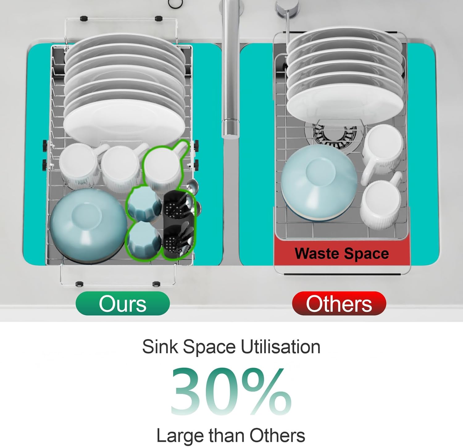- Stable 90° L-Shaped Suspension Design: Unlike other drying racks that rely on a single countertop contact, our embedded 90° L-frame lets the arms grip both the counter and the sink wall, creating dual support for even load distribution and rock-solid stability. It prevents tipping from uneven loads or bumps, protecting your tableware.