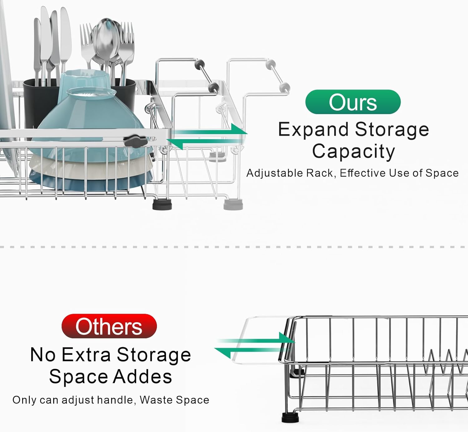- True Expandable, Real Capacity Boost: Unlike other racks that only extend handles, our dish drainer expands as a whole unit—truly increasing your drying space, allowing you to comfortably hold at least 3 extra cups in addition to 7 plates, bowls, utensils, and even fresh fruits and veggies. This innovative design not only ensures perfect sink compatibility but genuinely maximizes your drying area