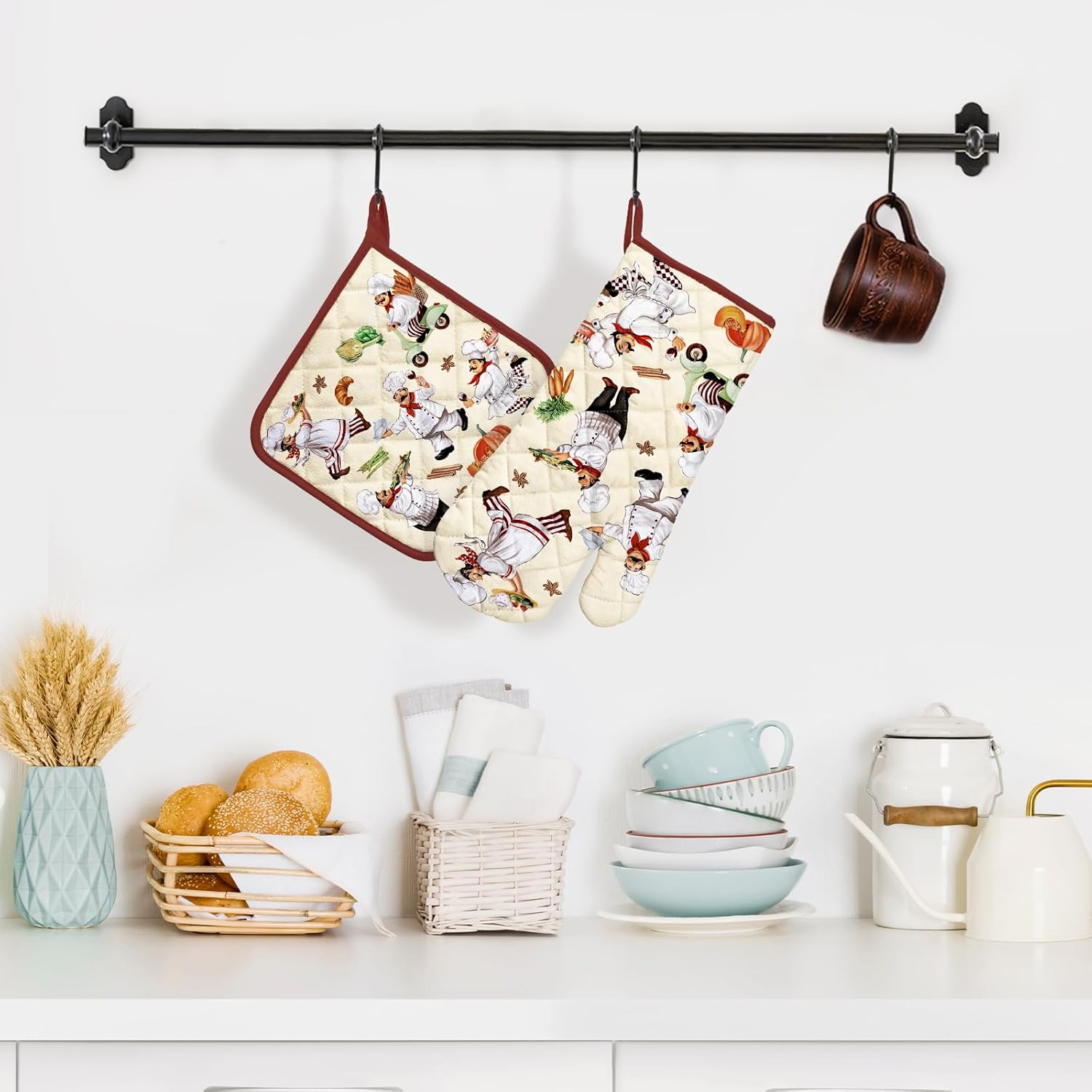 - PREFERRED MATERIAL: Each pot holders & oven mitts set is carefully crafted from 100% cotton, with dyes sourced from plants, digital printing technology and upgraded color fixing process, the colors are bright and fade-resistant. Cotton lining to bring you comfortable and breathable touch and protect your skin as well.