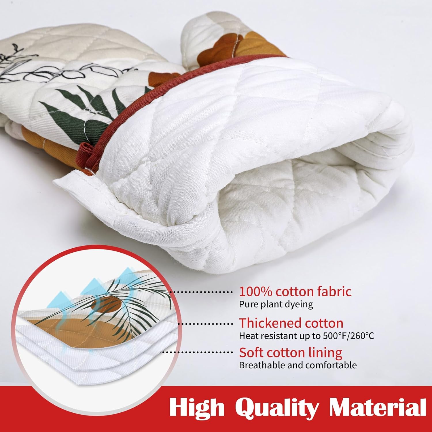 - PREFERRED MATERIAL: Each pot holders & oven mitts set is carefully crafted from 100% cotton, with dyes sourced from plants, digital printing technology and upgraded color fixing process, the colors are bright and fade-resistant. Cotton lining to bring you comfortable and breathable touch and protect your skin as well.
