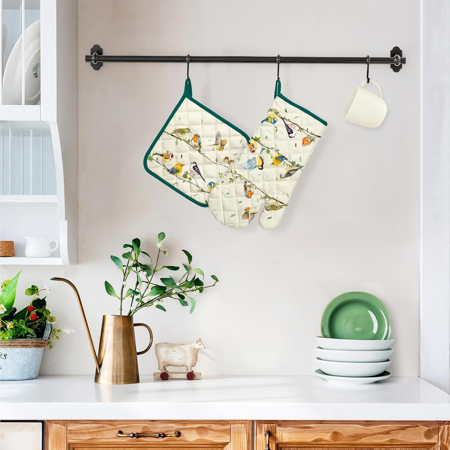 Bird Branch Oven Mitts and Pot Holders Sets 2Pcs, 100% Cotton Heat Resistant, Extra Long Oven Gloves Potholder for Kitchen Cooking Baking Decoration