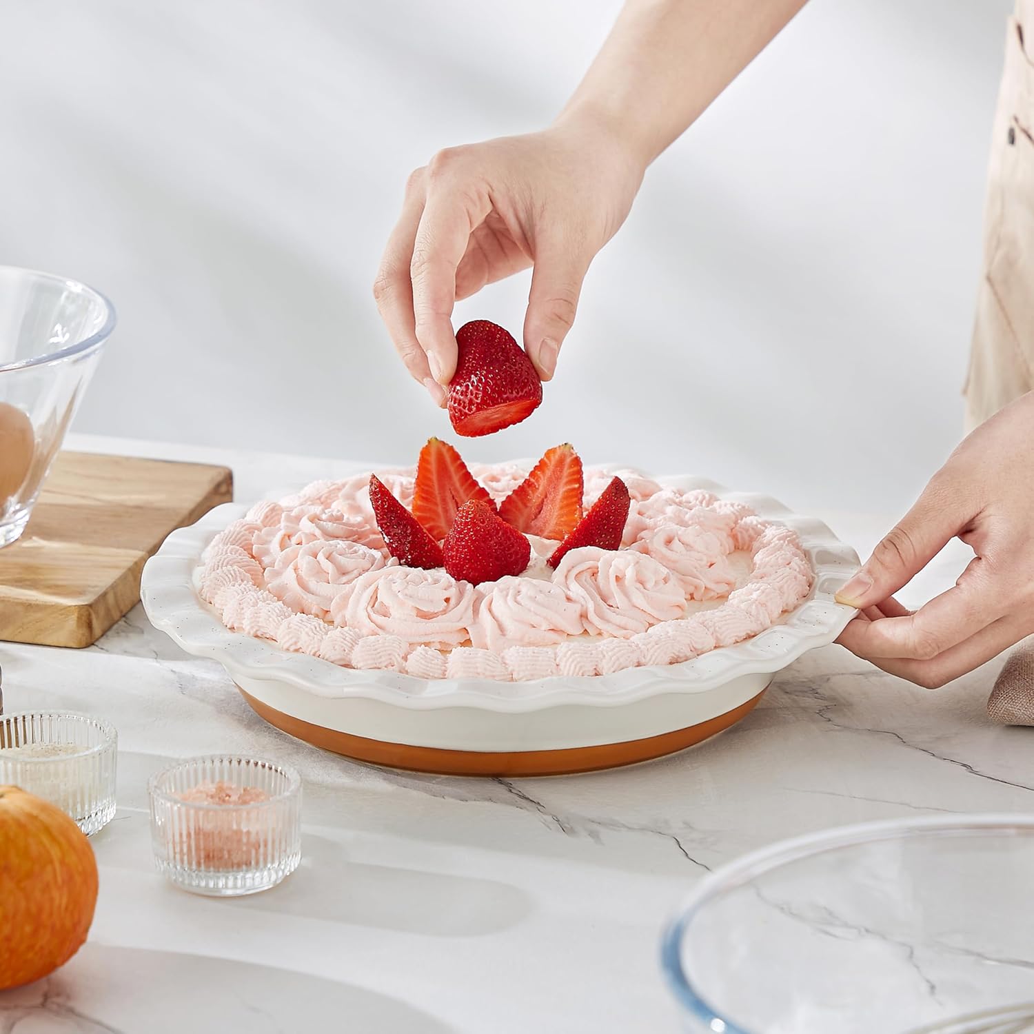 - 【Premium Nonstick Glaze】The lead and cadmium-free glaze provides a scratch-resistant, nonstick surface for easy release and effortless cleanup. This pie plate is safe for use in the oven, dishwasher, and refrigerator, making it a versatile addition to your kitchen.