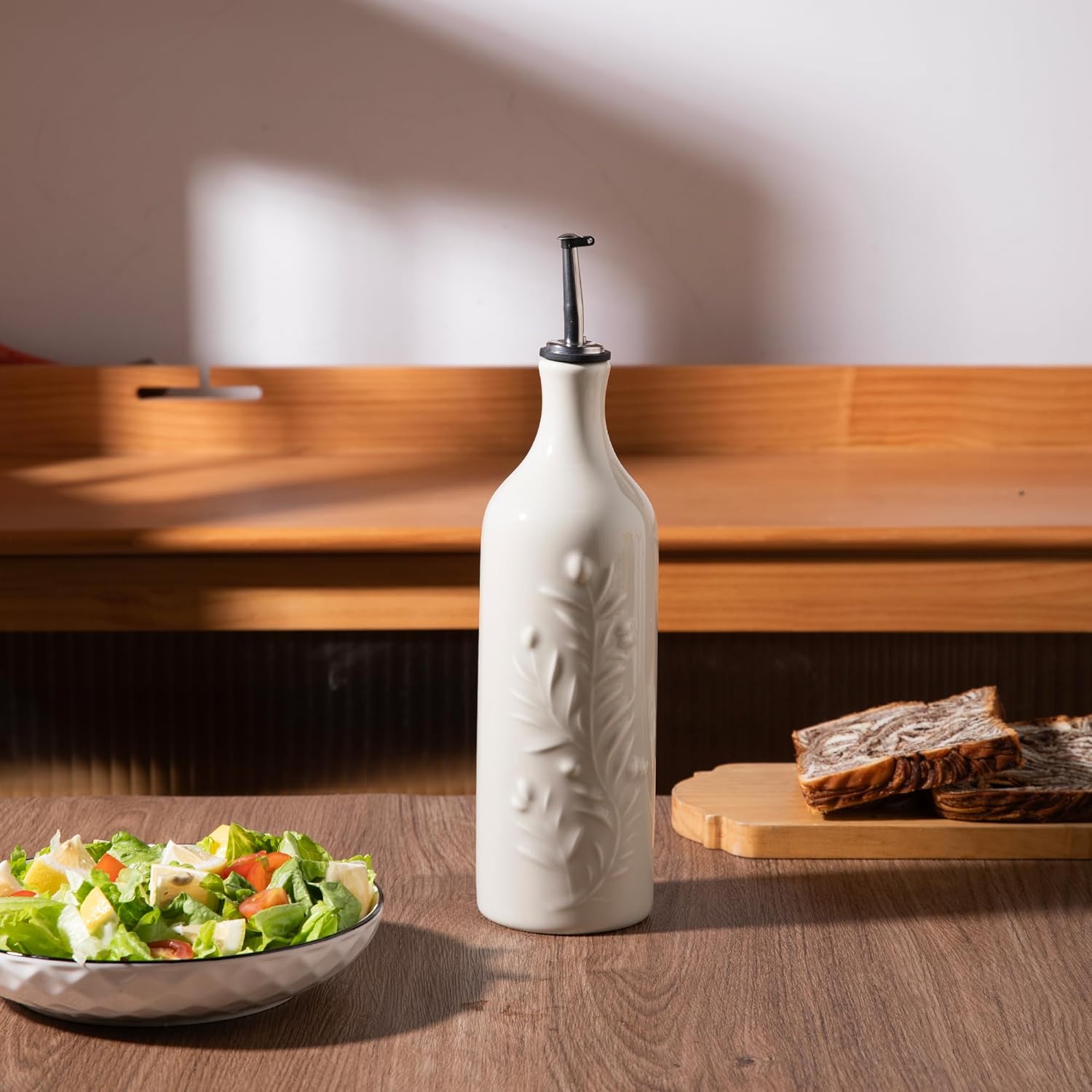 Sweejar Large Olive Oil Dispenser Bottle with Spout, 24 Oz Ceramic Oil Dispenser for Kitchen, Relief Opaque Oil Cruet, Oil Container for Cooking, EVOO, Avocado Oil, Vinegar, Pack of 1 (Beige)