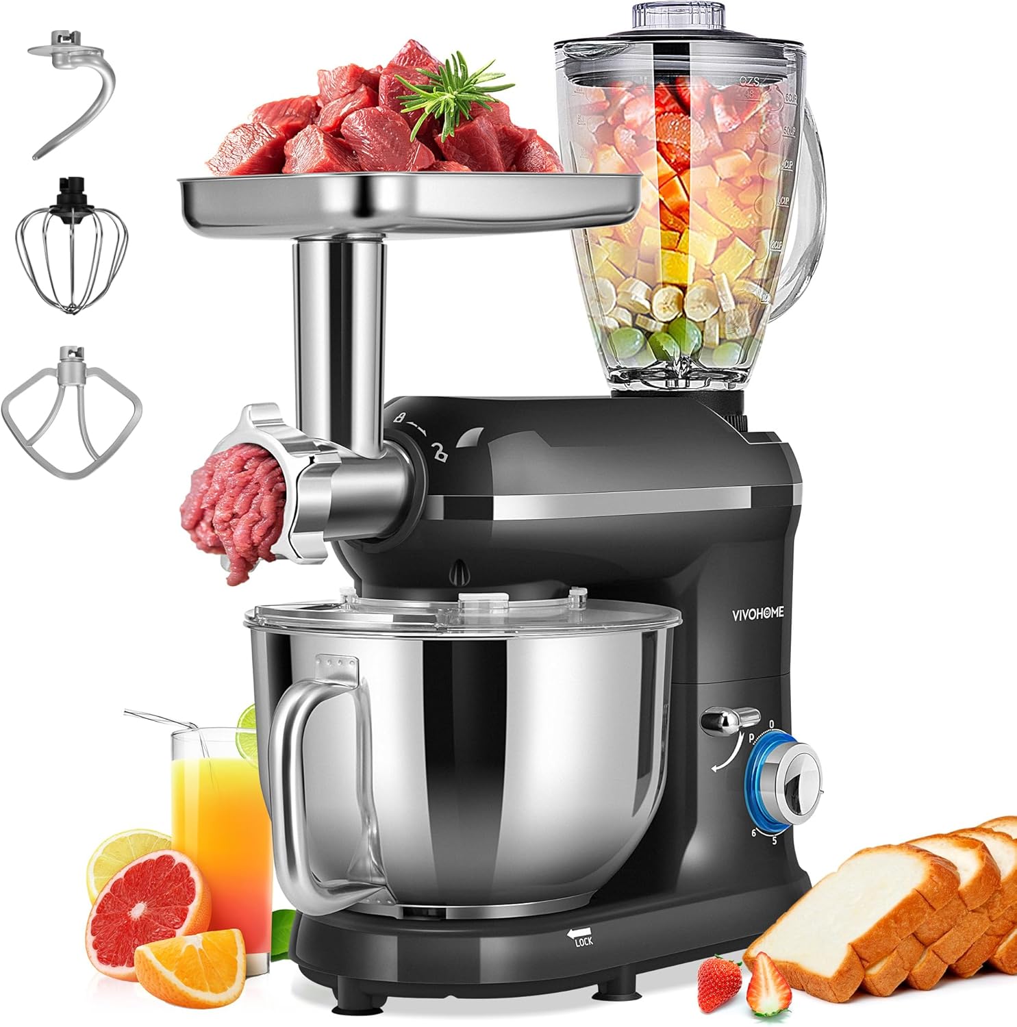 - COMPREHENSIVE ATTACHMENT SET: The VIVOHOME stand mixer comes with versatile attachments: an aluminum dough hook for kneading, a stainless steel wire whisk for whipping and beating, an aluminum beater for mixing, a meat grinder for sausages and burgers, and a 1.5 L large capacity juice blender with scale for fresh smoothies; All the tools you need are right at your fingertips