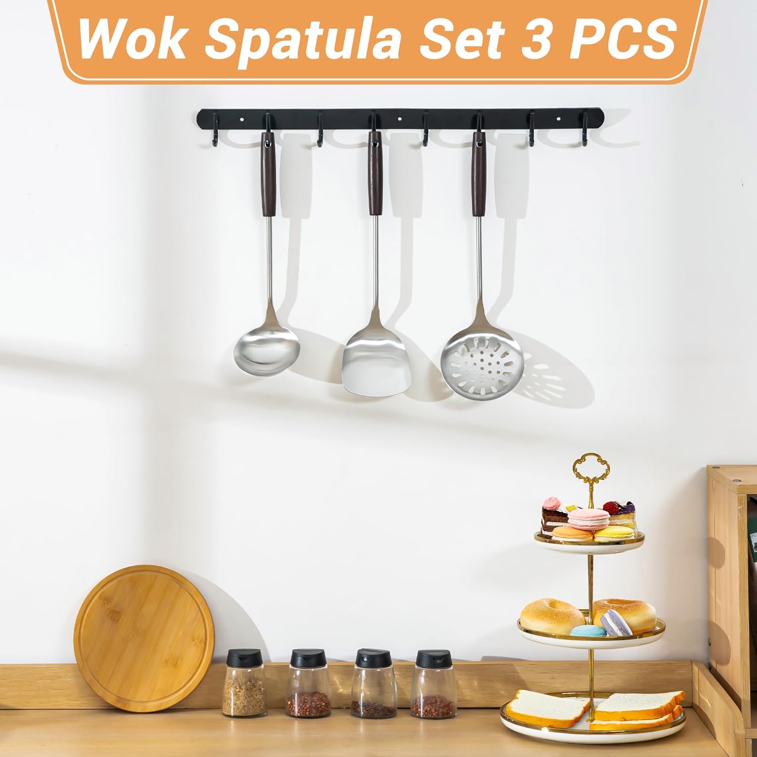 FJNATINH Wok Spatula and Ladle Skimmer Spoon - Stainless Steel Cooking Utensils Set of 3,Kitchen Wok Utensils Set