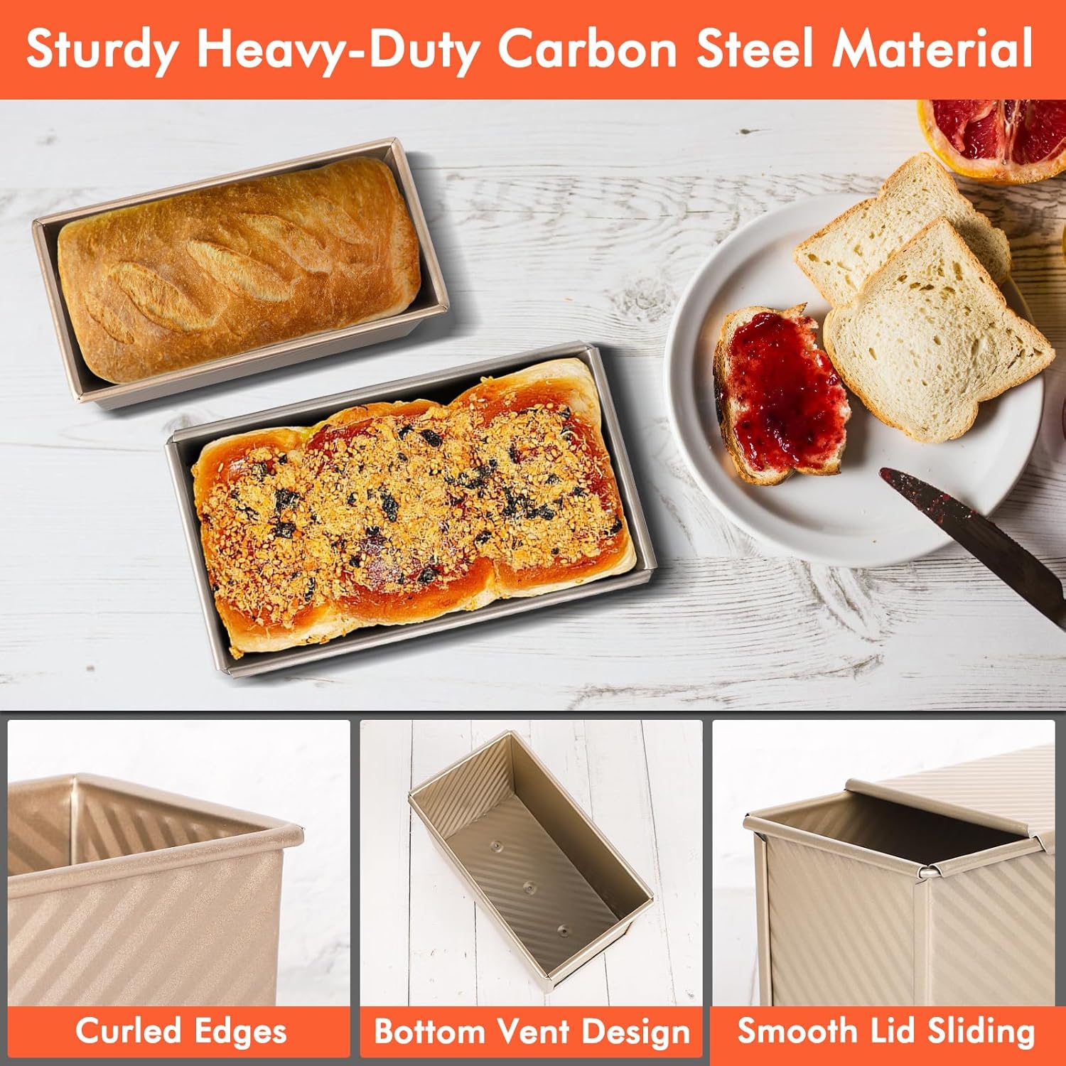 Beasea Pullman Loaf Pan with Lid, 2 Pack Non-Stick Bread Loaf Pans 1 lb & 0.5 lb Carbon Steel Bread Toast Box with Dough Scraper for Homemade Bread Toast Oven Baking - Gold