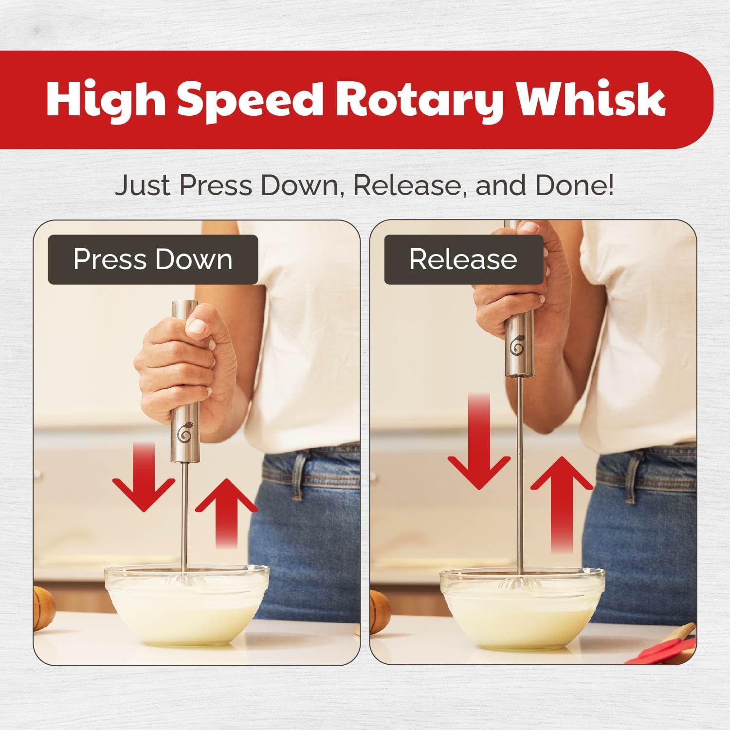 - QUICK AND EASY: Our stainless steel semi-automatic whisk is super fast and ultra-easy to use. To rotate the head on our easy whisk, simply push down and release up. Both of these actions will rotate our semi automatic whisk clockwise and then counterclockwise.