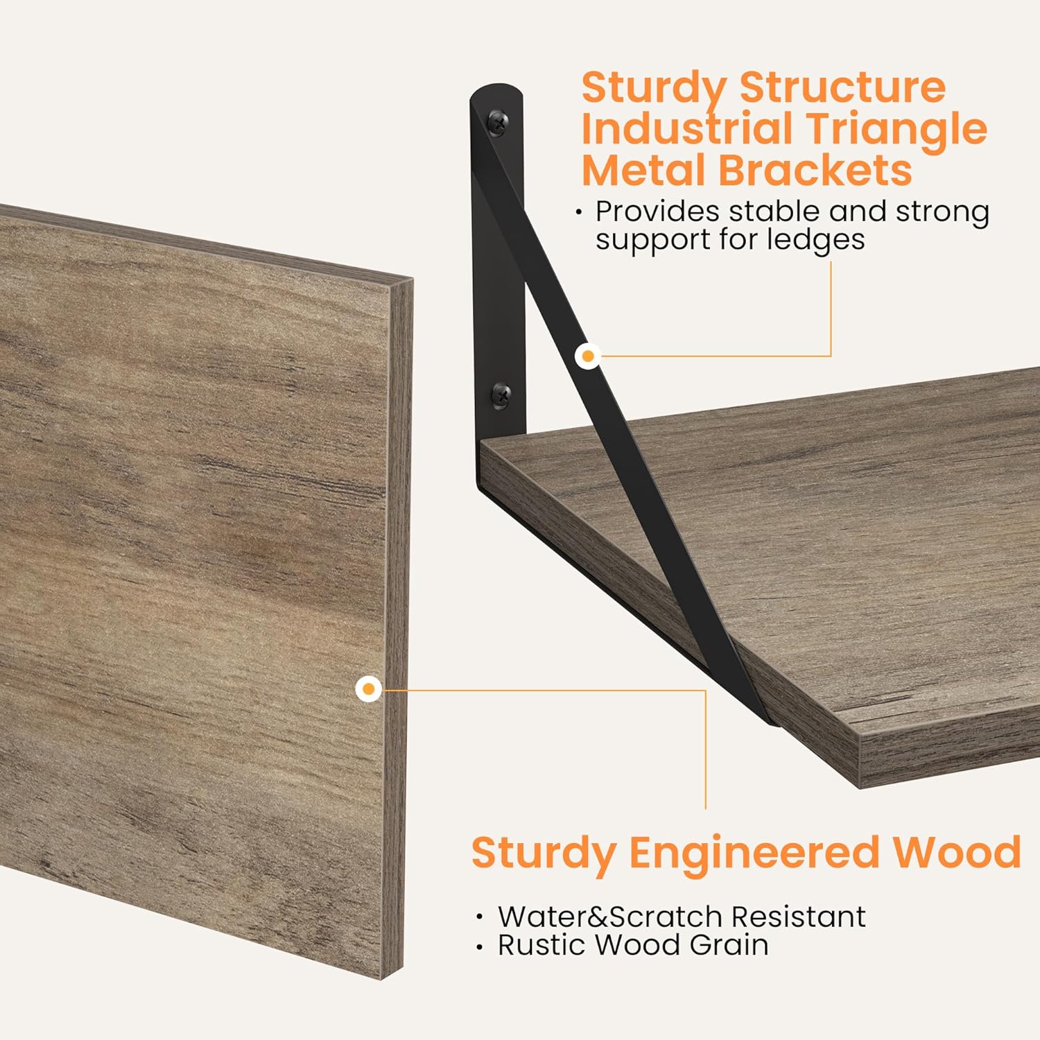 Heimlove Deep Floating Shelves for Wall, 16W x 12D Rustic Grey Wood Wall Shelves Set of 2, Large Floating Shelf for Living Room, Kitchen, Office, Bedroom and Decor Storage, with Metal Bracket - Grey