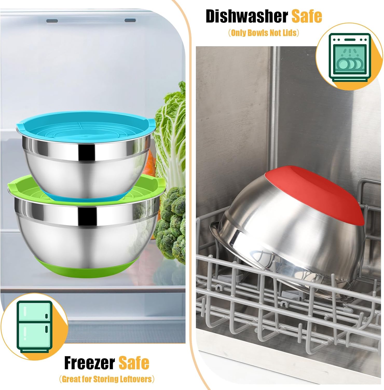 - 【Clean Easily & Classic】Stainless steel mixing bowl is crafted with brush-polished exterior and mirror-finished interior, For a shiny appearance and less sticking risks, Both two sides are easy to release food for convenient to clean by hand, And the bowls are also dishwasher safe to free your hands after use but the lids are hand wash recommended for its durability, Moreover, Shiny silver and colorful set would fit well in different styles of kitchens and bright your kitchen up