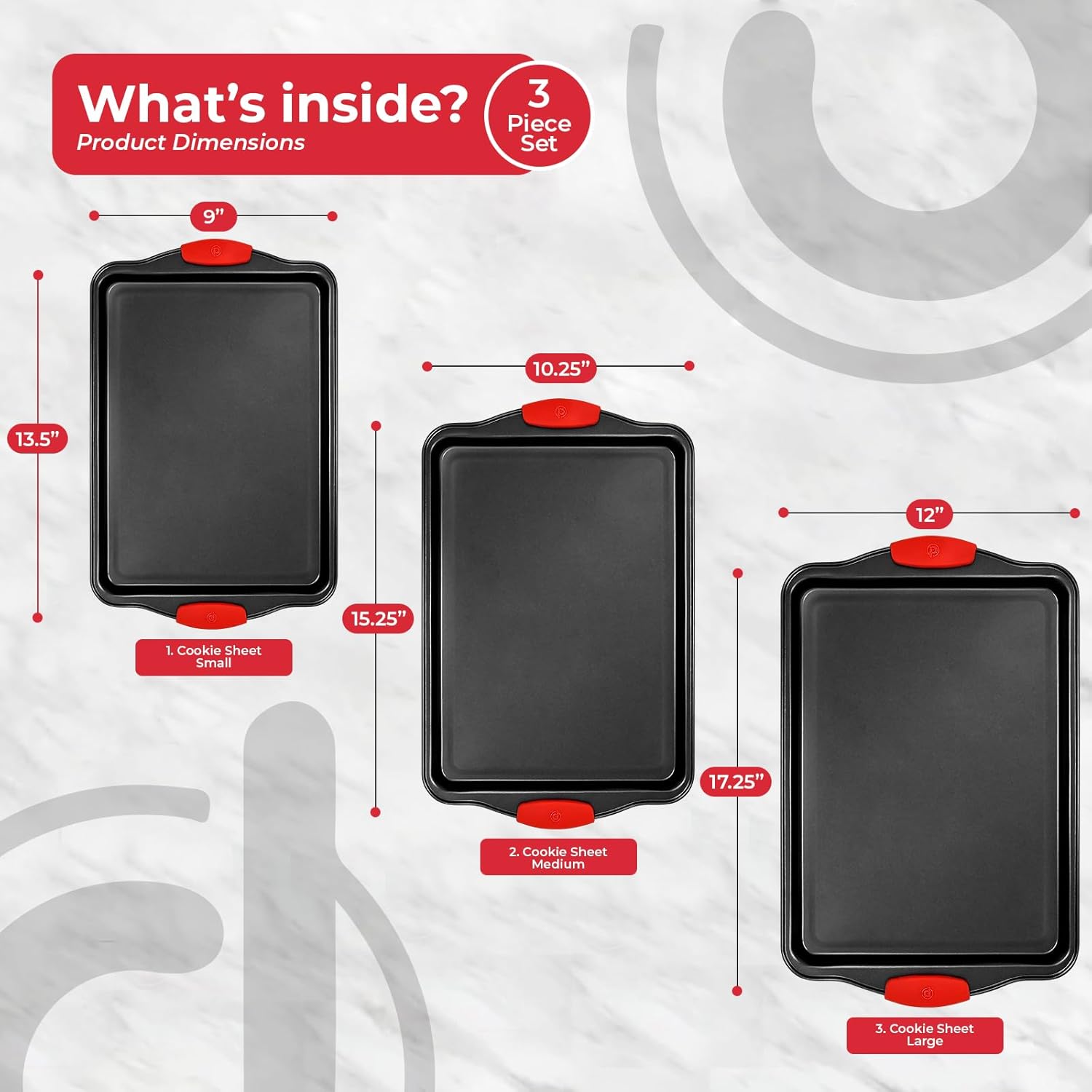 - HIGH-QUALITY CARBON-STEEL & HEAT-RESISTANT HANDLES: Made of excellent quality carbon steel materials, these non-toxic baking pans will remain in great condition for years. Plus, they come with heat-resistant red silicone handles for comfortable use.