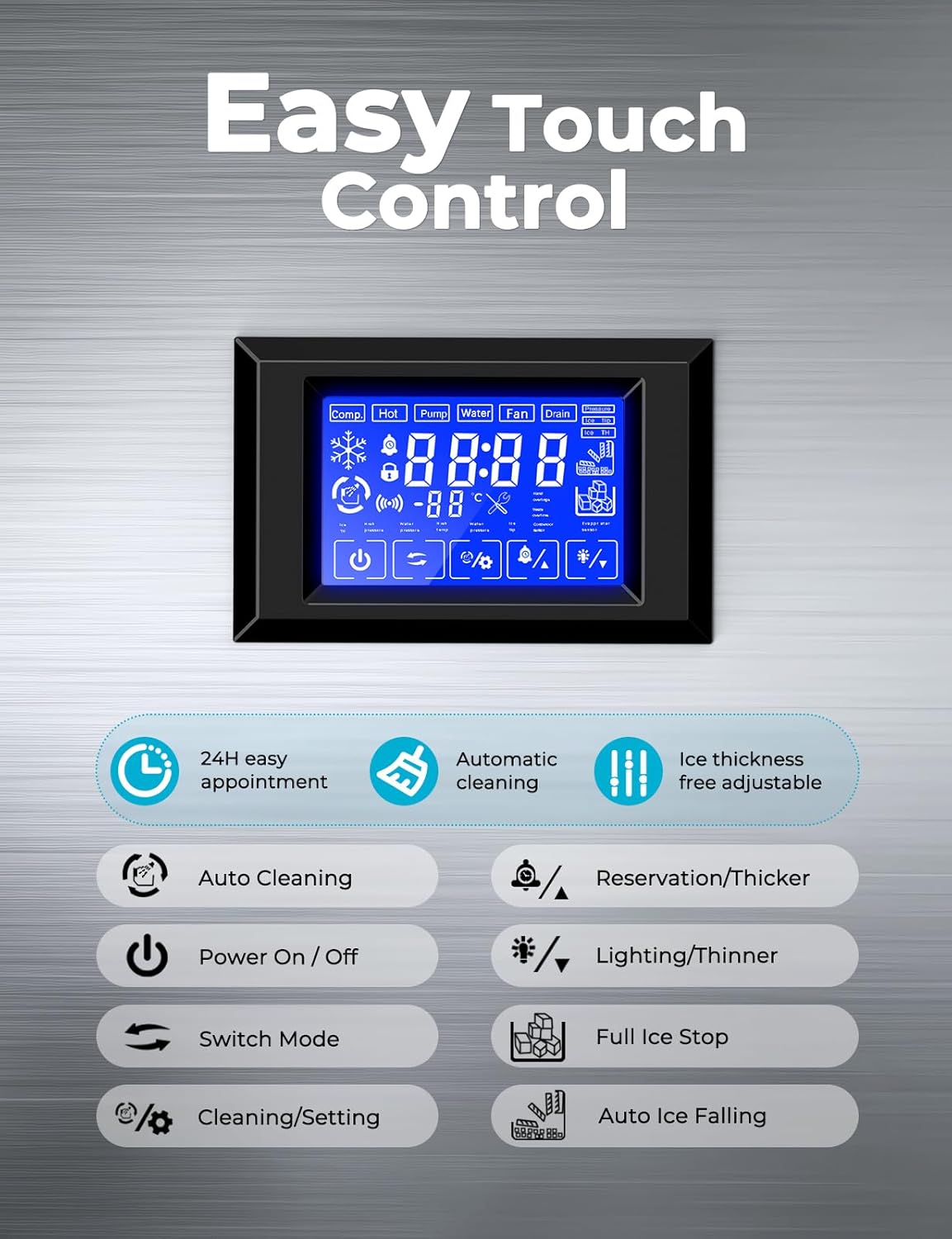 - 👍【LCD Intelligent Panel & One-Click Appointment & Automatic Cleaning】 With just a click on the user-friendly LCD panel, you can access a world of convenient features like 24-hour reservation, automatic self-cleaning, de-icing, and more. Plus, with adjustable settings for ice-making time and size, you can customize your ice to suit any occasion. Say goodbye to ice-making hassles and hello to perfectly chilled drinks every time!