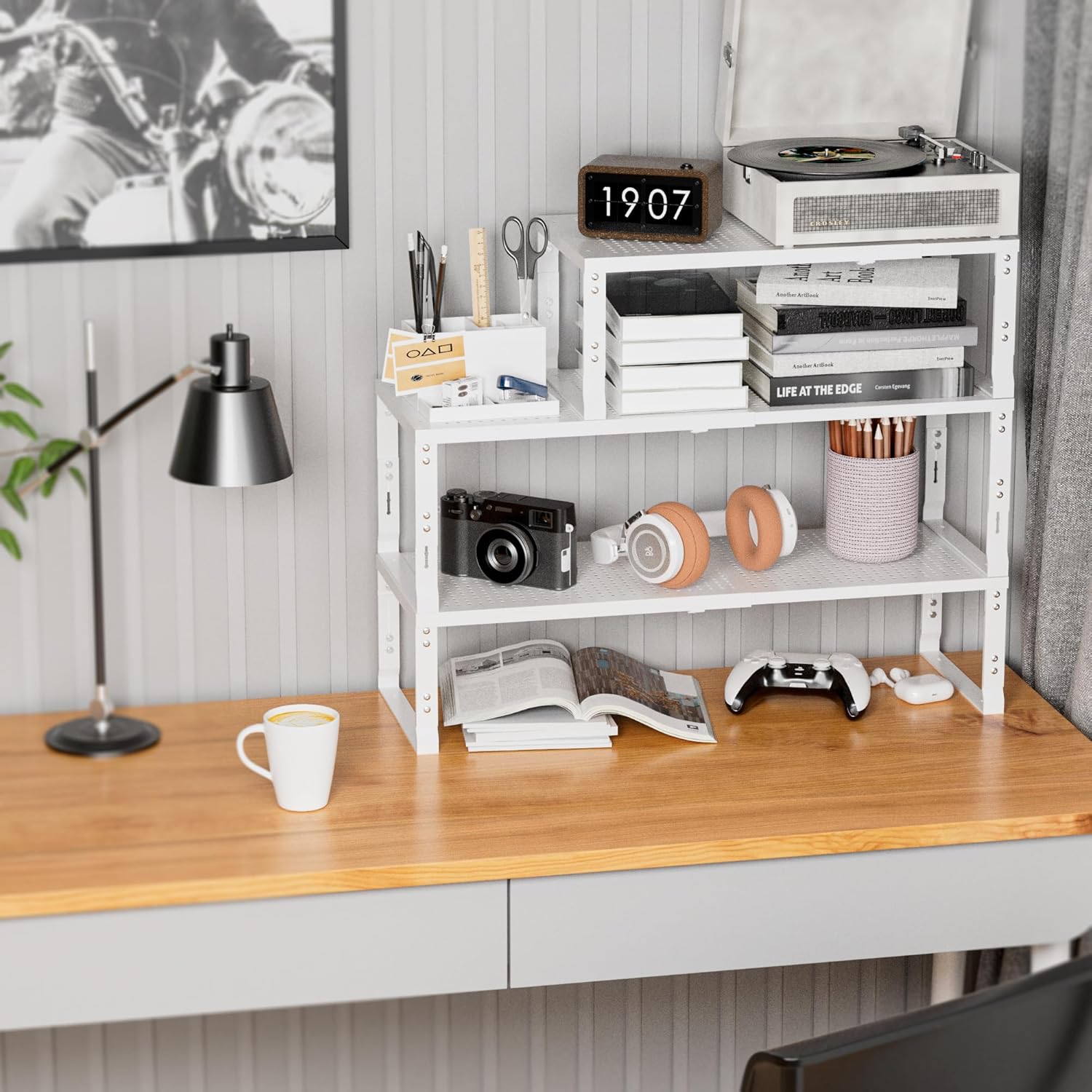 - ⭐【Expandable,Stackable】The shelves can easily expand and contract according to your storage needs, whether it is kitchen clutter or office supplies.You can combine multiple shelves together to form a large storage system, or separate them into several separate smaller units(Measure:8.11"D x 16.54"W~27.17"W x 8.31"H/7.68"H/7.05"H/6.42"H)