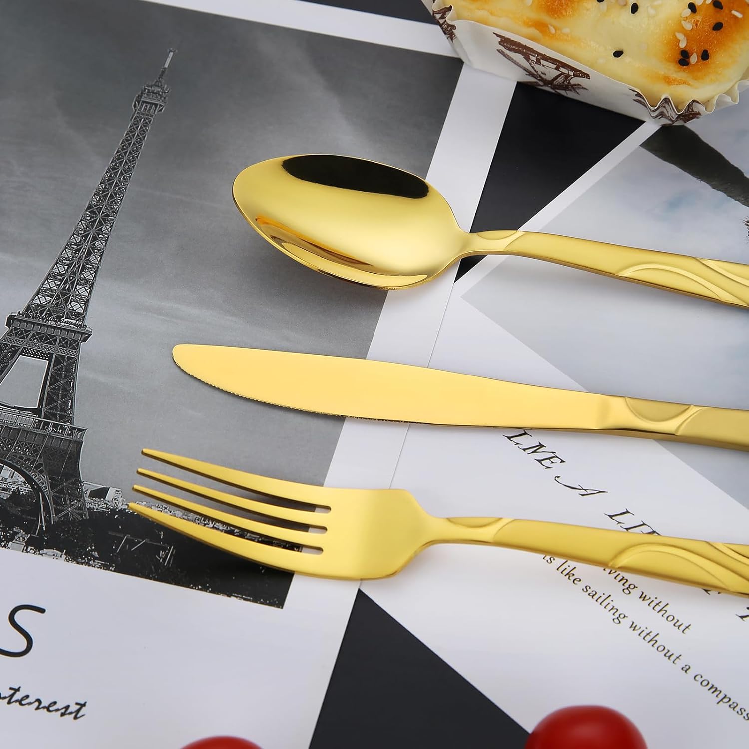 - Excellent design: The timeless sanding design and unique decorative pattern that remains perpetually stylish, this gold stainless steel tableware set serves as the perfect complement to any table setting, adding a touch of sophistication to your table. The spoons and forks undergo meticulous polishing to ensure impeccably smooth edges.