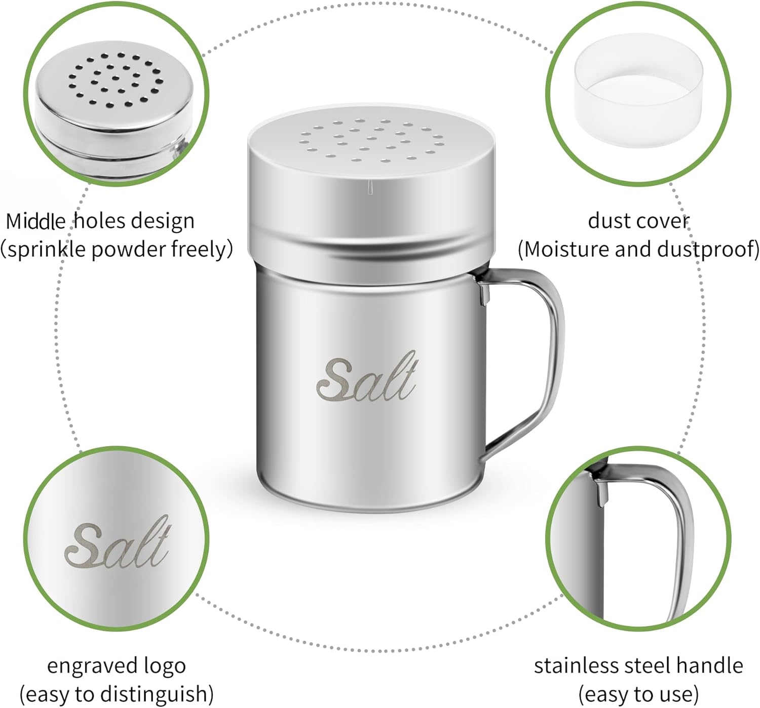 Stainless Steel Salt and Pepper Shakers Set, 6 OZ Seasoning Spice Shaker with Lid and Handle Medium Holes, Metal Dredge Shaker for Powder Sugar Cooking Kitchen Baking (2 Pieces)