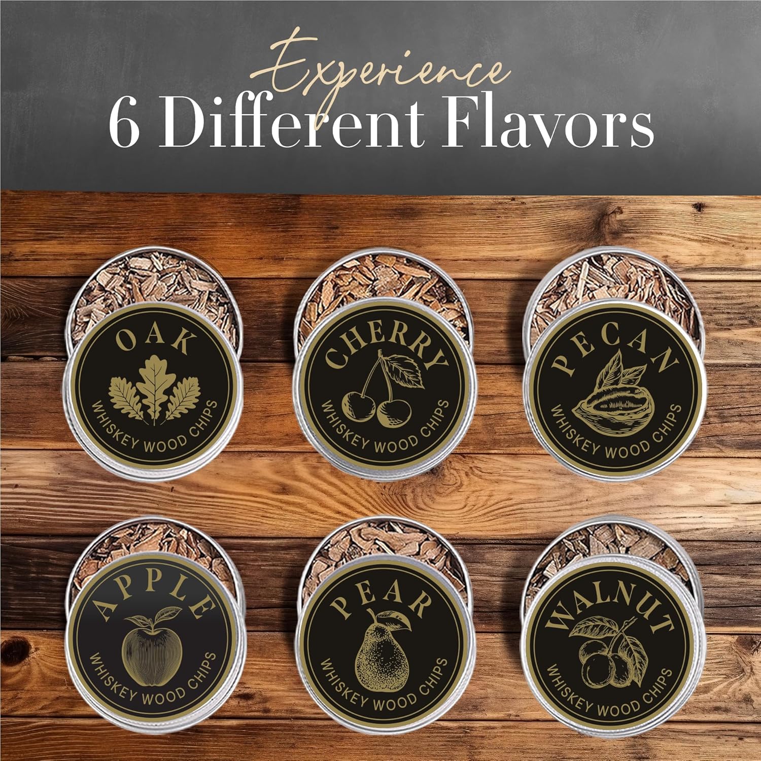 - INCLUDES 6 AROMATIC WOOD CHIPS – Cherry, oak, pecan, apple, walnut & pear deliver bold, custom flavors. Ideal bourbon gifts for dad, boyfriend gifts, and whiskey accessories for men.
